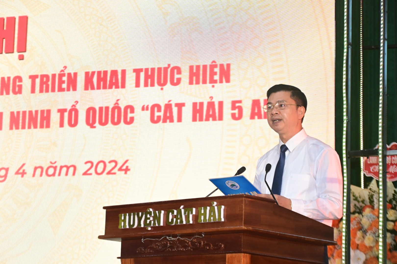 Thay mặt Ban Chỉ đạo 799 thành phố, Phó Chủ tịch UBND thành phố Lê Khắc Nam tiếp thu những ý kiến chỉ đạo của Trung tướng Lê Quốc Hùng, Thứ trưởng Bộ Công an. Để tiếp tục nhân rộng những kết quả đã đạt được, Trưởng Ban Chỉ đạo 799 thành phố yêu cầu huyện ủy, UBND huyện Cát Hải giữ vững kết quả và tiếp tục triển khai thực hiện hiệu quả mô hình thực sự hợp lòng dân, vừa sức dân, vì lợi ích của nhân dân. Các quận, huyện khác tiếp tục thực hiện hiệu quả mô hình “05 an”. Các ngành, địa phương, đơn vị khi ban hành các chủ trương, biện pháp, kế hoạch xây dựng phong trào toàn dân bảo vệ an ninh Tổ quốc phải xuất phát từ yêu cầu bảo đảm an ninh trật tự, phù hợp đặc điểm địa bàn, dân cư, lĩnh vực, nghề nghiệp….Đối với lực lượng Công an tập trung hiện thực hóa mục tiêu xây dựng lực lượng Công an từ cơ sở thật sự trong sạch, vững mạnh, chính quy, tinh nhuệ, hiện đại, đáp ứng yêu cầu, nhiệm vụ trong tình hình mới theo Nghị quyết số 12 của Bộ Chính trị. Gắn kết chặt chẽ phong trào toàn dân bảo vệ an ninh Tổ quốc với các phong trào cách mạng, Chương trình mục tiêu xây dựng nông thôn mới, tạo nền tảng, tiền đề cho việc quy hoạch, xây dựng, quản lý và phát triển bền vững đô thị Việt Nam đến năm 2030 tầm nhìn đến 2045 theo tinh thần Nghị quyết số 06-NQ/TW ngày 24/01/2022 của Bộ Chính trị.