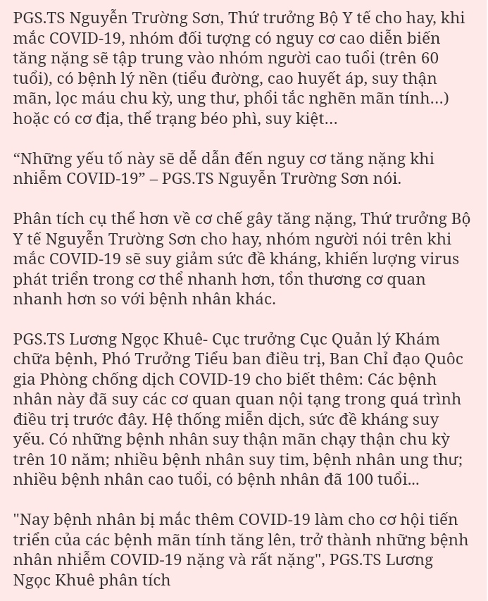 Các trường hợp tử vong đều là người cao tuổi, trên nền bệnh lý nặng như suy thận mạn giai đoạn cuối, ung thư máu giai đoạn cuối không đáp ứng hoá chất, hội chứng mạch vành, suy hô hấp cấp, thoái hoá đa khớp, tăng huyết áp, suy thượng thận mạn, đái tháo đường tuyp 2…
