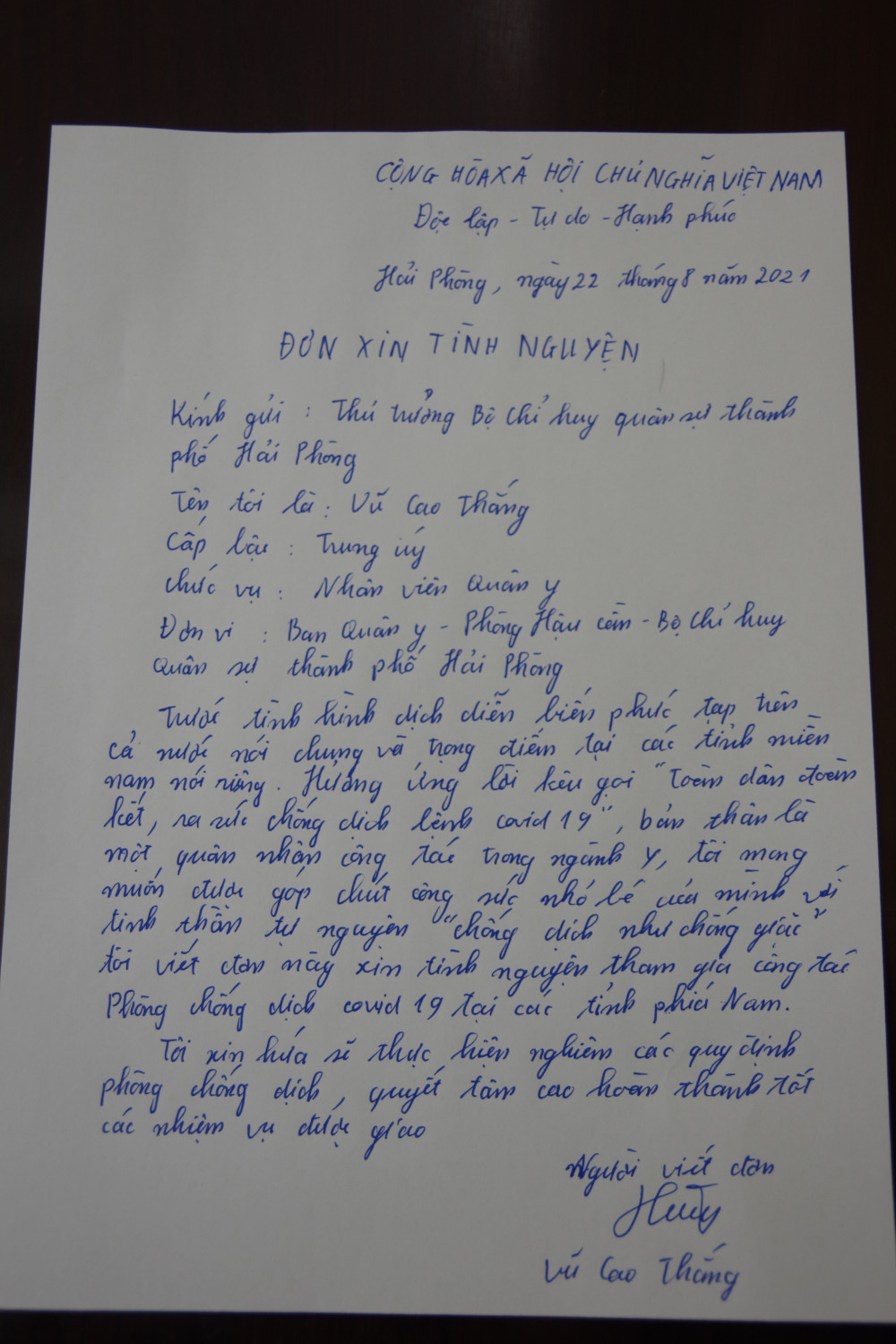 Trước những diễn biến phức tạp của dịch COVID-19 tại các tỉnh phía Nam, sau khi được quán triệt Điện số 106/ĐK TK ngày 22/8/2021 của Bộ Tư lệnh Quân khu 3 về việc điều động xe cứu thương, nhân viên quân y tăng cường cho Quân khu 7 phục vụ chống dịch COVID-19, nhiều quân nhân là nhân viên quân y, lái xe thuộc Bộ CHQS thành phố Hải Phòng đã viết đơn tình nguyện, xung phong vào các tỉnh phía Nam chống dịch COVID-19.
