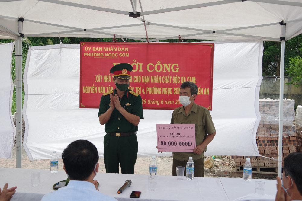 Sáng 29/6, Bộ CHQS thành phố Hải Phòng phối hợp với Hội Nạn nhân chất độc Da cam thành phố và UBND phường Ngọc Sơn (quận Kiến An) tổ chức Lễ khởi công xây nhà tình nghĩa cho ông Nguyễn Văn Tập, sinh năm 1954; trú tại Tổ dân phố Khúc Trì 4, phường Ngọc Sơn, quận Kiến An là nạn nhân chất độc Da cam.