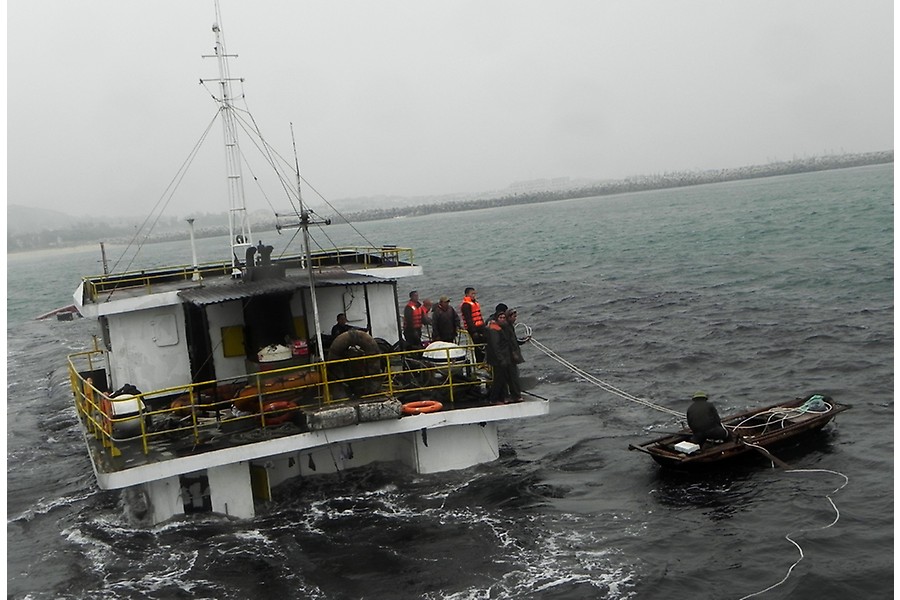 Cán bộ, chiến sĩ Đồn biên phòng Bạch Long Vỹ tiếp cận tàu cá bị chìm.