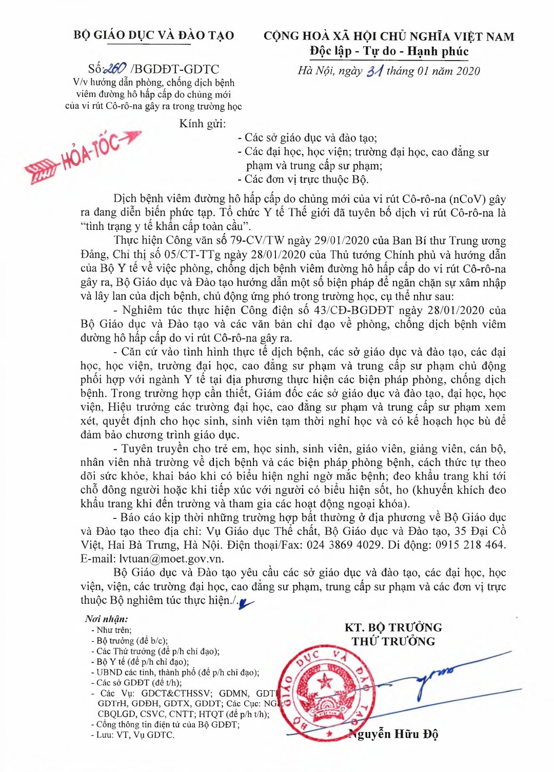 Trước tình hình trên, Bộ Giáo dục và Đào tạo vừa ra văn bản số 260/BGDĐT ngày 31/01/2020 về việc hướng dẫn phòng, chống dịch bệnh viêm đường hô hấp cấp do chủng mới của vi rút Corona gây ra trong trường học.