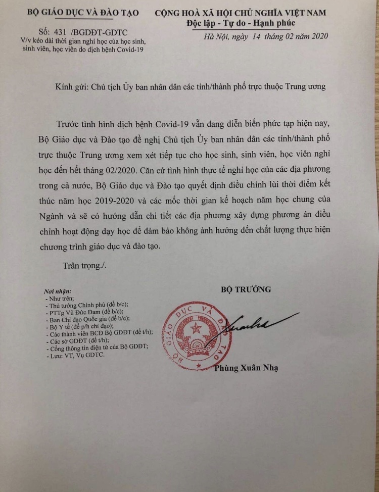 Cuối chiều 14-2, Bộ trưởng Bộ GD-ĐT Phùng Xuân Nhạ đã ký công văn số 431/BGDĐT-GDTC gửi Chủ tịch UBND các tỉnh, thành phố trực thuộc Trung ương về việc kéo dài thời gian nghỉ học của học sinh, sinh viên, học viên do dịch Covid-19, xem xét cho học sinh, sinh viên, học viên toàn quốc nghỉ học đến hết tháng 2-2020.