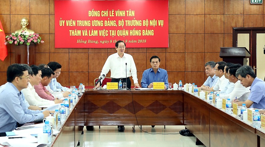 Chiều 8-8, đồng chí Lê Vĩnh Tân, Ủy viên Trung ương Đảng, Bộ trưởng Bộ Nội vụ làm việc tại UBND quận Hồng Bàng, nghe báo cáo về phương án sắp xếp các đơn vị hành chính cấp quận, huyện, xã, phường, tổ dân phố trên địa bàn thành phố và quận Hồng Bàng từ nay đến năm 2021 theo nghị quyết số 1211 của Ủy ban Thường vụ Quốc hội và Kế hoạch số 07 của Bộ Chính trị; những vướng mắc, kiến nghị về tiêu chuẩn phường trong sắp xếp phường, tổ dân phố; về biên chế giáo dục và điều chỉnh địa giới mở rộng quận Hồng Bàng. Các đồng chí: Nguyễn Văn Tùng, Chủ tịch UBND thành phố; Nguyễn Xuân Bình, Phó chủ tịch Thường trực UBND thành phố cùng làm việc.