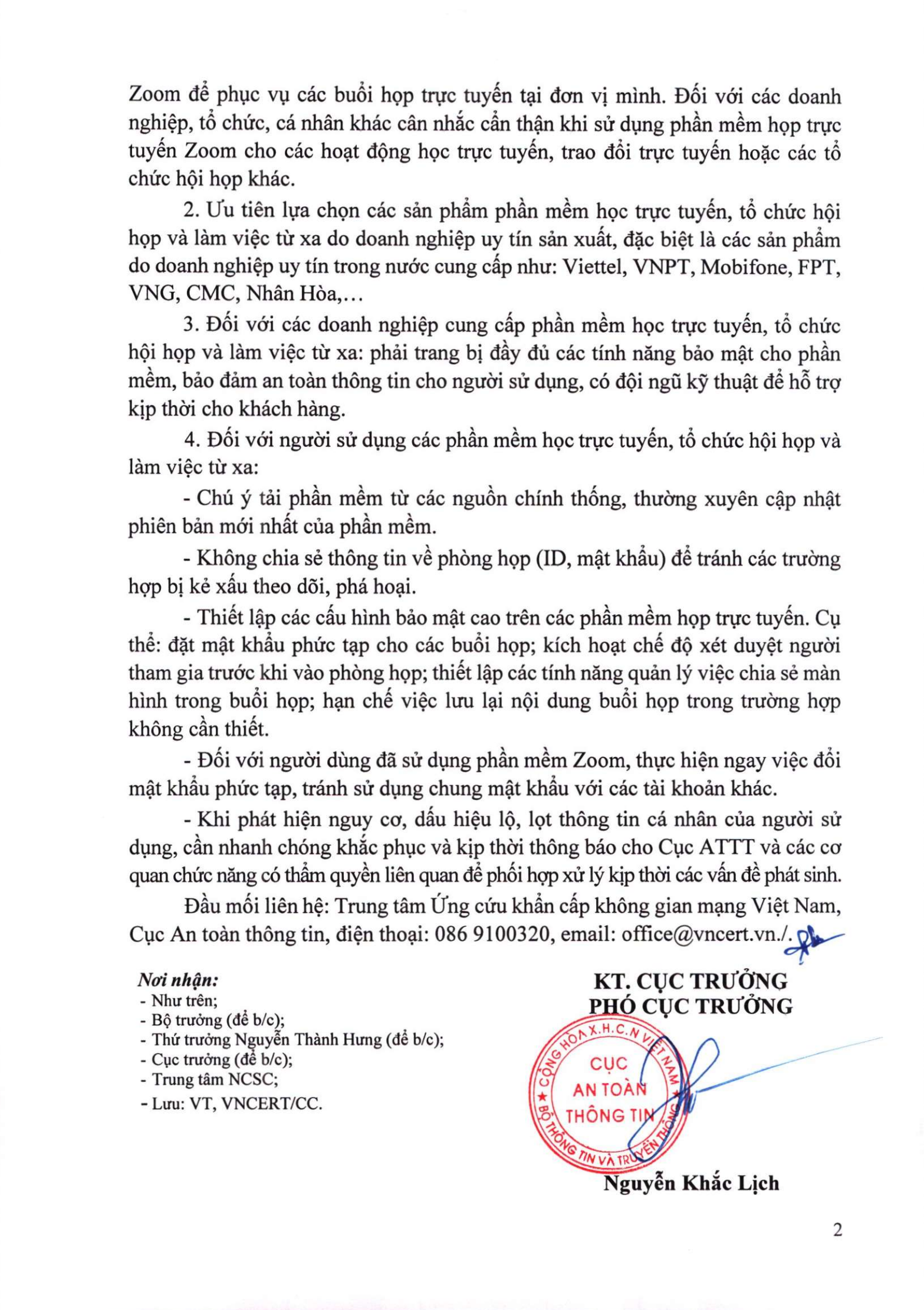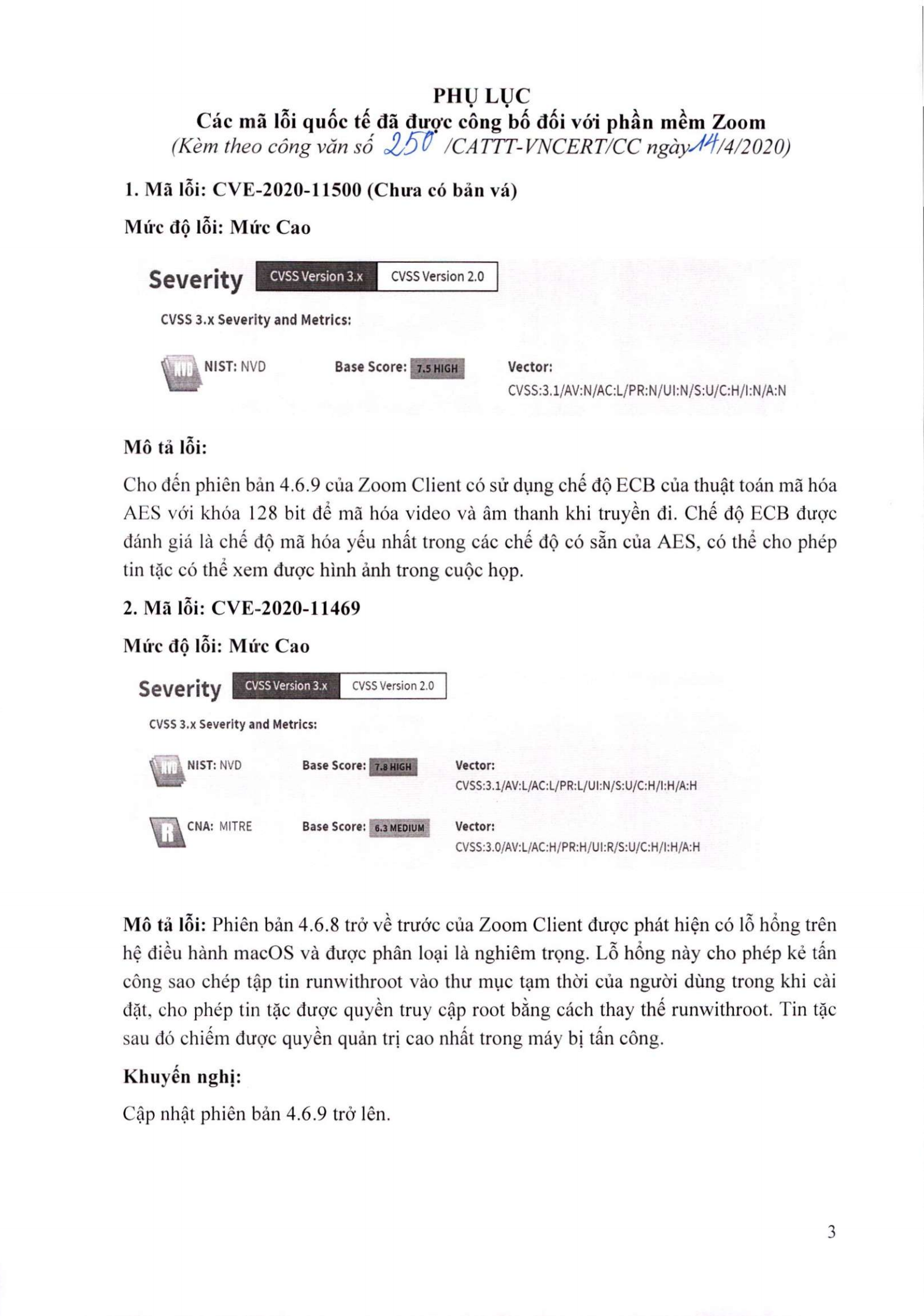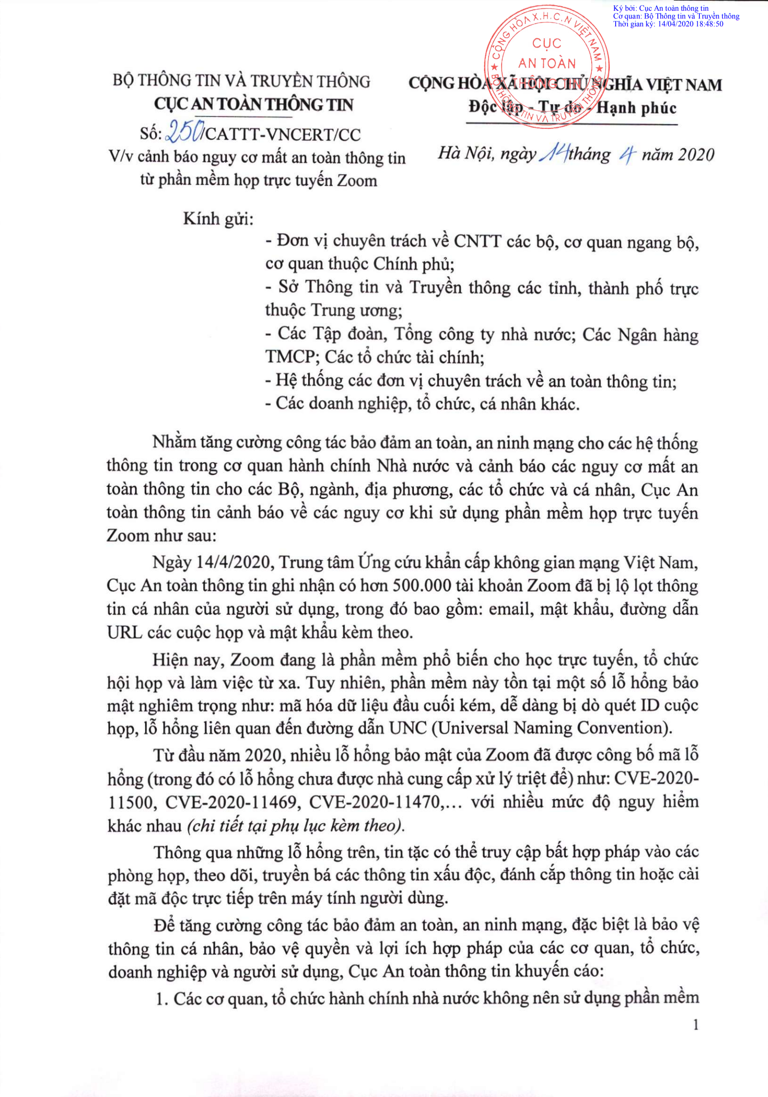 Ngày 14/4/2020, Trung tâm Ứng cứu khẩn cấp không gian mạng Việt Nam – Cục An toàn thông tin đã đưa ra công văn cảnh báo số 250/CATTT-VNCERTCC về việc cảnh báo nguy cơ mất an toàn thông tin từ phần mềm họp trực tuyến ZOOM.
