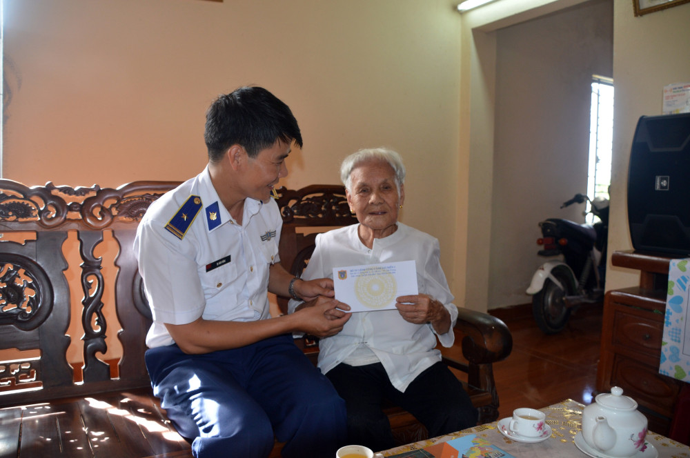 Tại buổi lễ, thay mặt Thường vụ Đảng uỷ, Thủ trưởng BTL Vùng Cảnh sát biển 1, Đại tá, Chính uỷ Trần Văn Rồng đã trao quà và số tiền phụng dưỡng hàng tháng là 500.000 đồng cho Mẹ Trần Thị Bệ. Ân cần thăm hỏi sức khỏe. đồng chí Chính uỷ BTL Vùng chúc Mẹ luôn sống vui, sống khoẻ cùng con cháu. Ngoài số tiền hỗ trợ, phụng dưỡng hàng tháng, BTL Vùng sẽ tổ chức thăm hỏi, động viên, tặng quà Mẹ nhân các ngày Lễ, Tết, khi ốm đau; phối hợp với gia đình, địa phương tổ chức tang lễ khi Mẹ qua đời.
