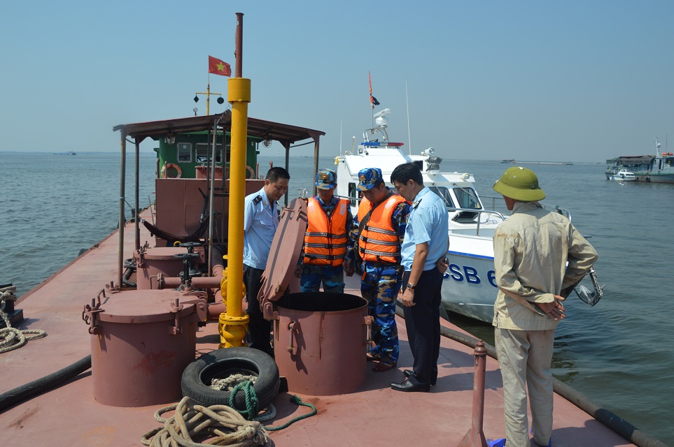 Lực lượng chức năng kiểm tra số dầu trên tàu