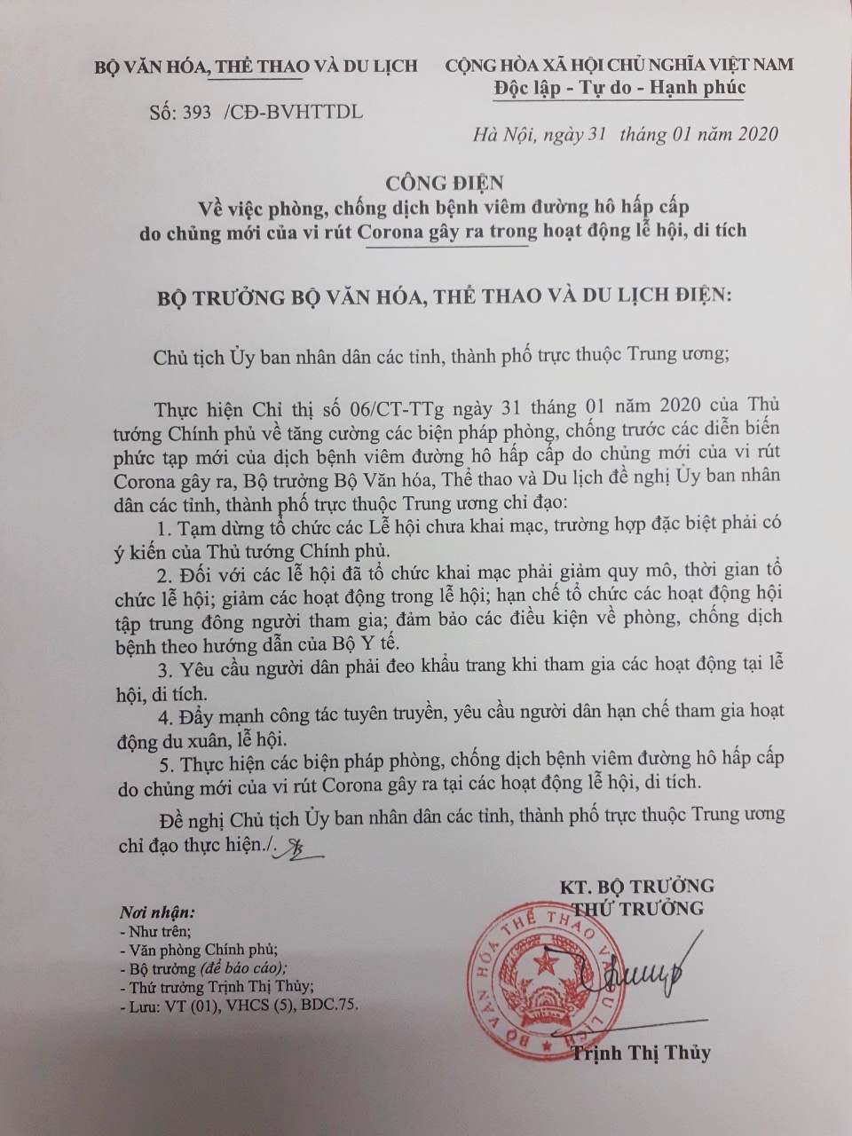 Ngày 31/01/2020, Bộ trưởng Bộ Văn hóa, Thể thao và Du lịch đã có Công điện số 393/CĐ-BVHTTDL gửi Chủ tịch Ủy ban nhân dân các tỉnh, thành phố trực thuộc Trung ương về việc phòng, chống dịch bệnh viêm đường hô hấp cấp do chủng mới của vi rút Corona gây ra trong hoạt động lễ hội, di tích.