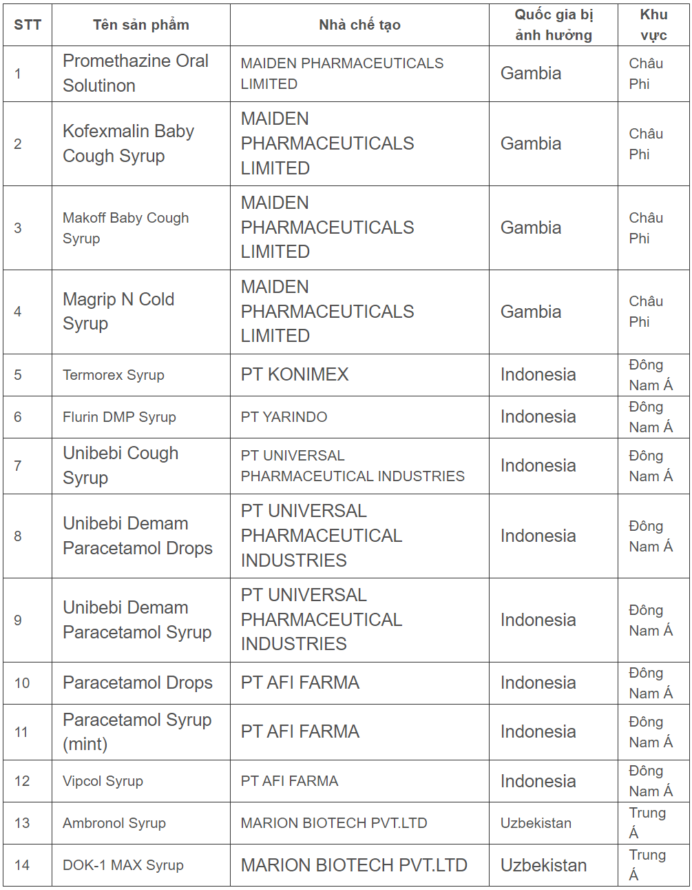 Trước đó, ngay từ tháng 10/2022, Tổ chức Y tế Thế giới (WHO) đã thông báo hàng chục trẻ nhỏ ở Gambia, một quốc gia ở Tây Phi tử vong do tổn thương thận cấp tính có thể liên quan đến siro trị ho, cảm bị nhiễm độc do một nhà sản xuất thuốc của Ấn Độ sản xuất.