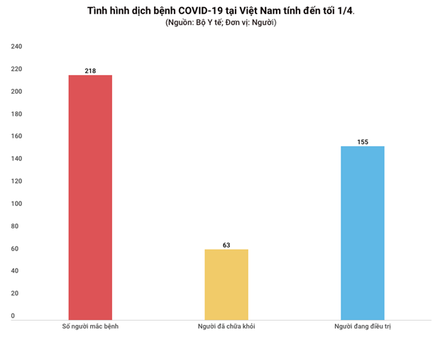 Như vậy, tại Việt Nam, tính đến tối 1/4 cả nước ghi nhận 218 trường hợp mắc, trong đó 63 bệnh nhân đã được công bố khỏi bệnh.