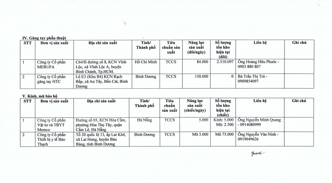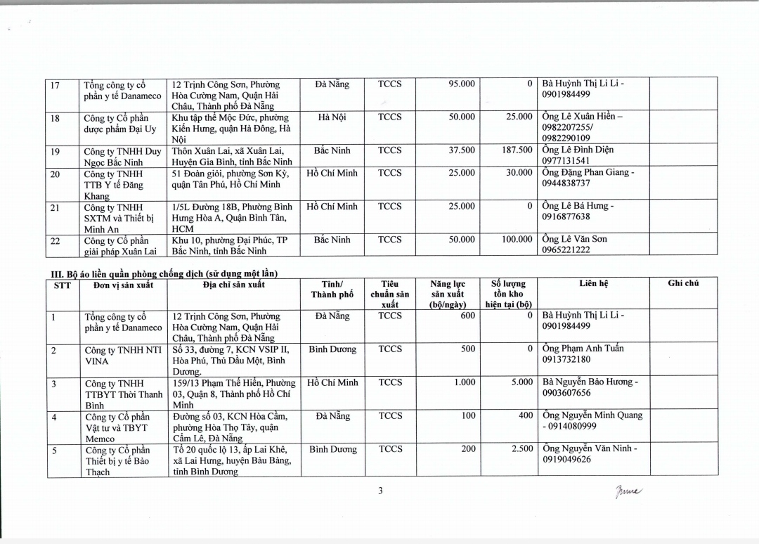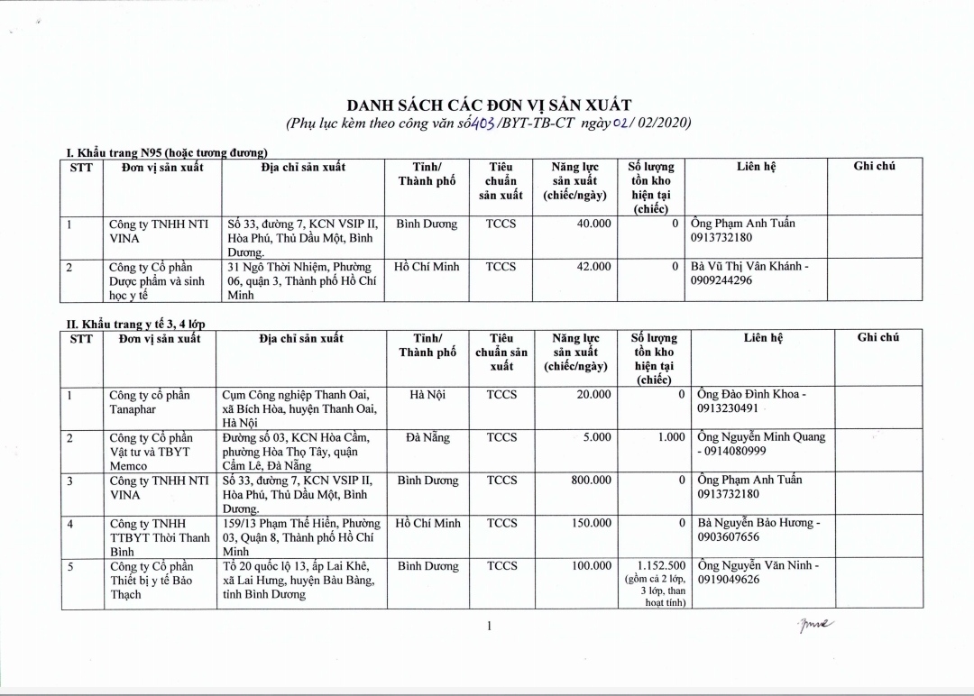 Căn cứ số liệu theo dõi, nắm bắt và báo cáo của các đơn vị sản xuất trong ước, Bộ Y tế thông báo nhanh danh sách các đơn vị sản xuất khẩu trang y tế và trang phục phòng, chống dịch (Phụ lục đính kèm – danh sách sẽ tiếp tục được cập nhật) để các Sở Y tế và các bệnh viện chủ động liên hệ, có kế hoạch trang bị phòng, chống dịch bệnh theo chỉ đạo của Chính phủ và hướng dẫn của Bộ Y tế.
