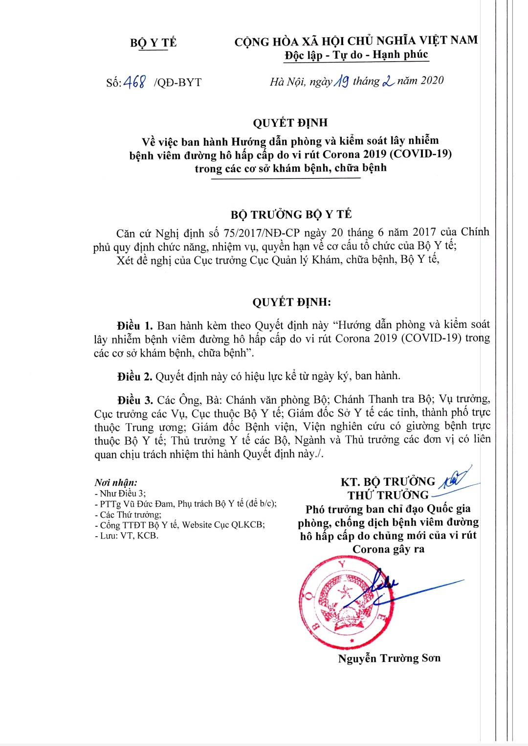 Bộ Y tế đã ban hành Quyết định số 468/QĐ-BYT ngày 19/02/2020 về việc Hướng dẫn phòng và kiểm soát lây nhiễm bệnh viêm đường hô hấp cấp do vi rút Corona 2019 (COVID-19) trong các cơ sở khám bệnh, chữa bệnh.