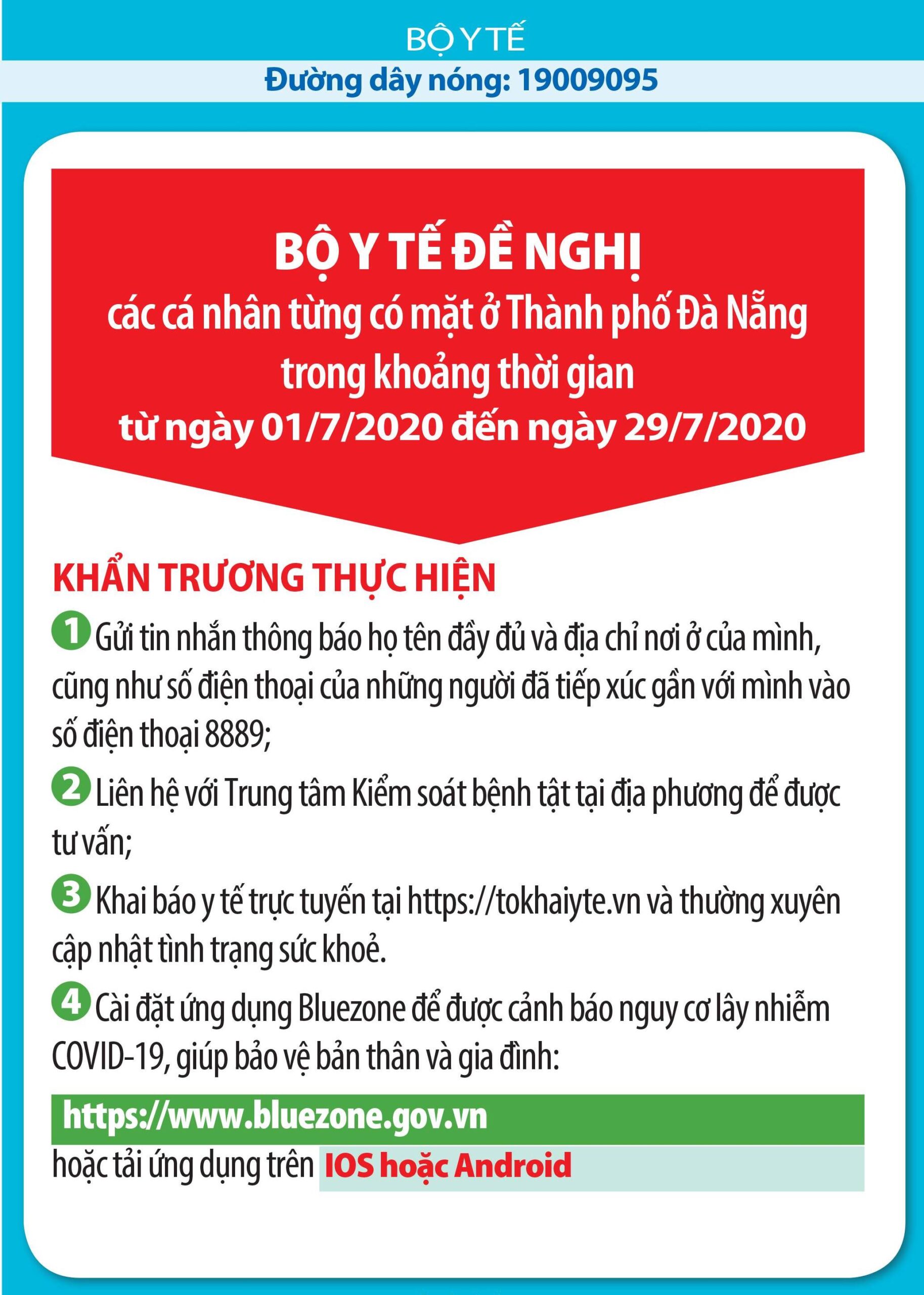 * Trong ngày 29/7, Bộ Y tế đã ban hành Thông báo khẩn số 18, đề nghị những cá nhân đi tới một số địa điểm ở Đà Nẵng, Quảng Nam, Hà Nội, TP Hồ Chí Minh cần làm theo các hướng dẫn của cơ quan chức năng phòng ngừa dịch bệnh.