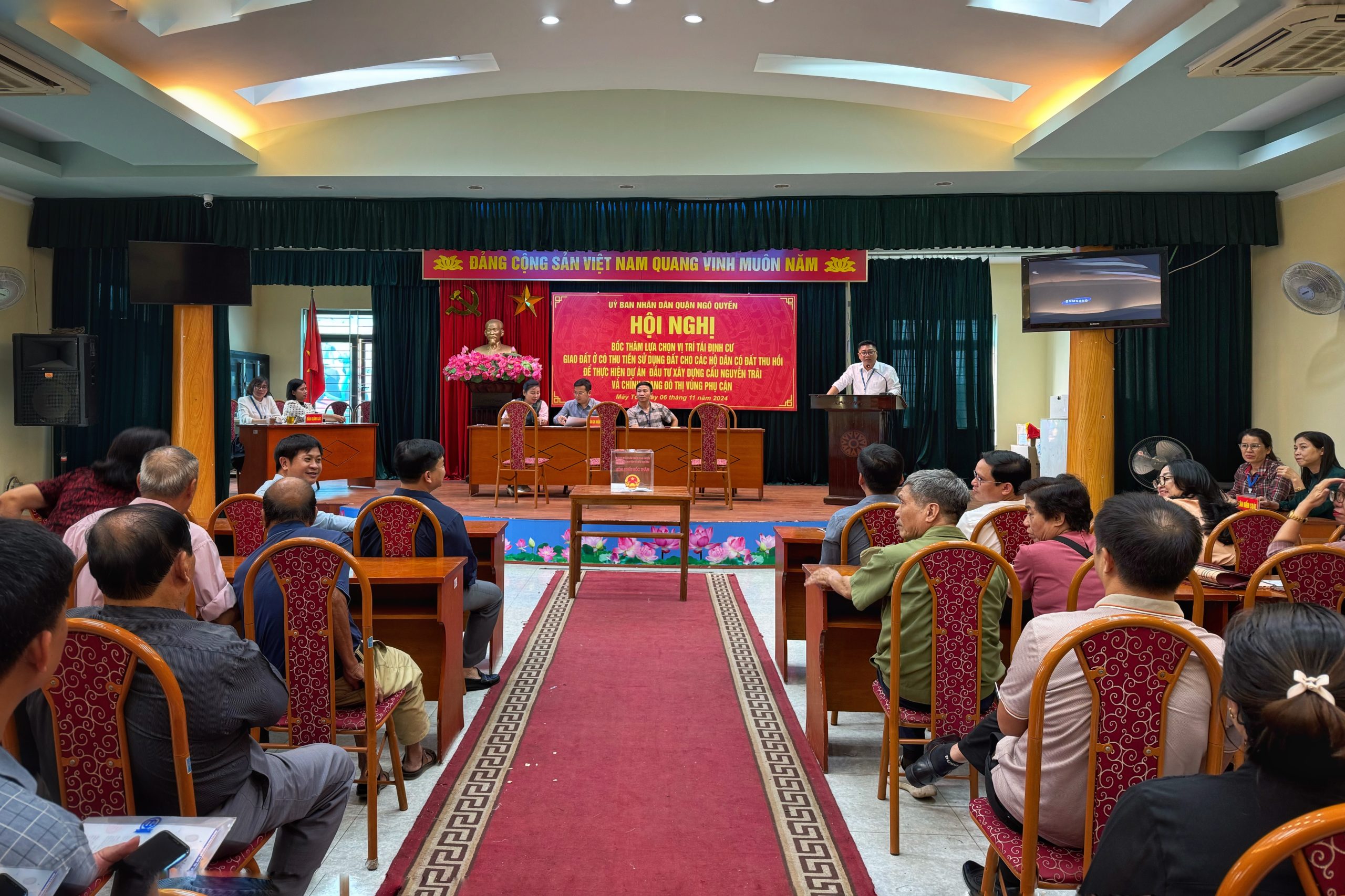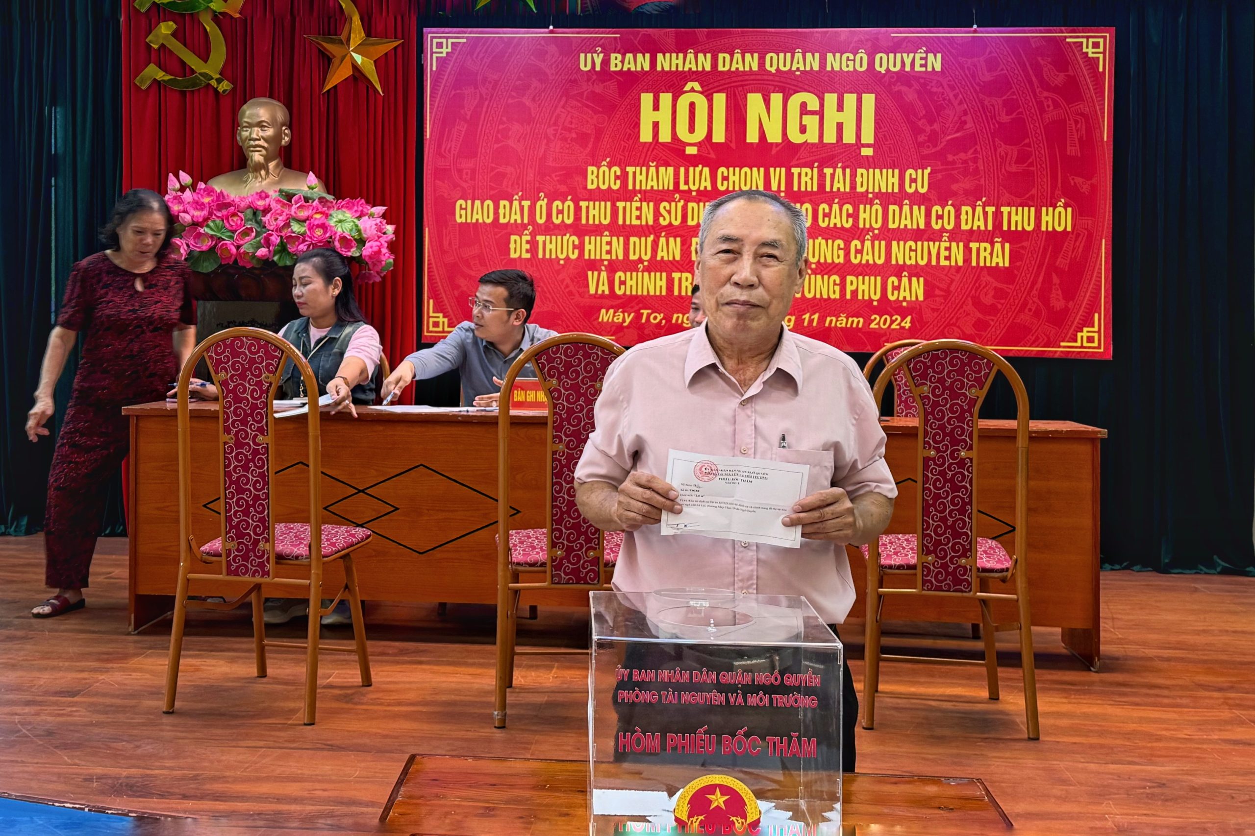 Chiều 6/11, tại trụ sở UBND phường Máy Tơ, UBND quận Ngô Quyền tổ chức Hội nghị bốc thăm lựa chọn vị trí tái định cư, giao đất ở có thu tiền sử dụng đất cho các hộ dân có đất bị thu hồi để thực hiện Dự án Đầu tư xây dựng (ĐTXD) cầu Nguyễn Trãi và chỉnh trang đô thị vùng phụ cận.