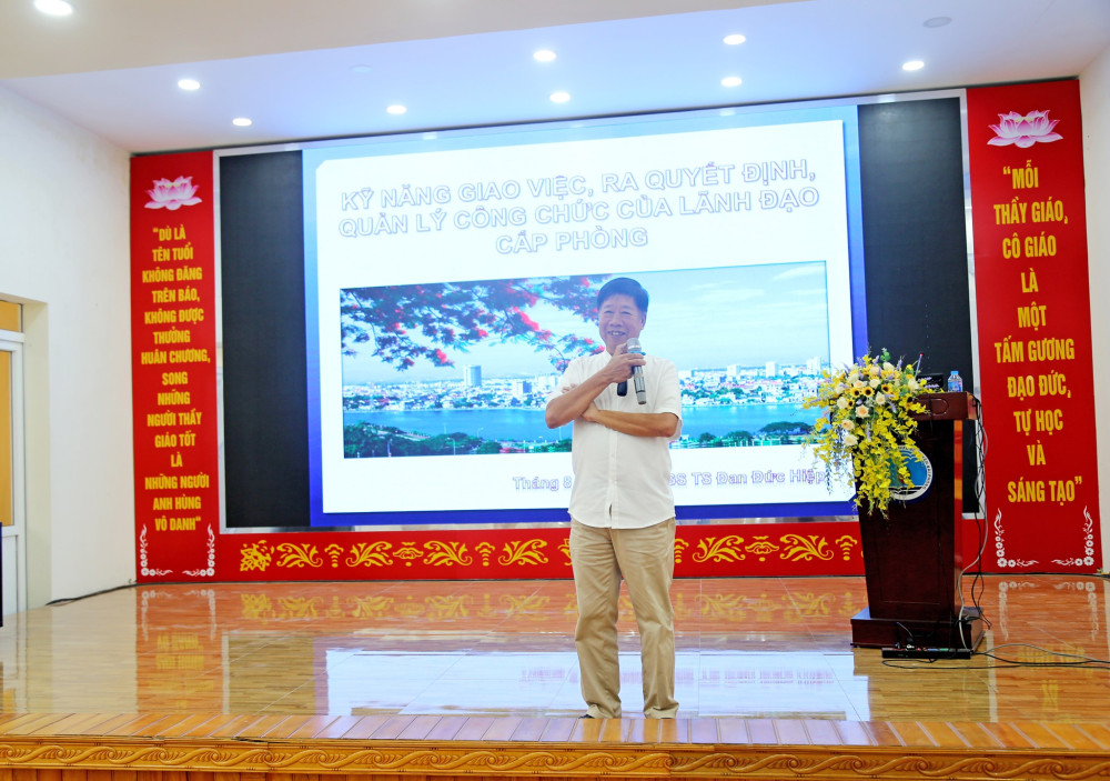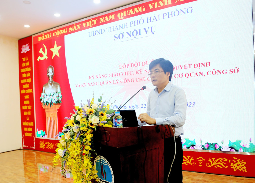 Tại Lớp bồi dưỡng kỹ năng giao việc, ra quyết định và kỹ năng quản lý công chức trong cơ quan, công sở; PGS.TS Đan Đức Hiệp, nguyên Phó Chủ tịch Thường trực UBND thành phố trao đổi, chia sẻ về một số kỹ năng giao việc của cán bộ cấp phòng; kỹ năng ra quyết định của cán bộ cấp phòng; kỹ năng quản lý công chức của cán bộ cấp phòng.