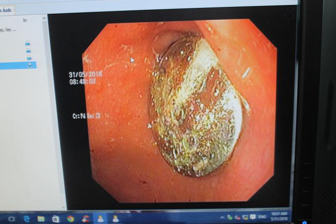 Sau 2 ngày theo dõi cho thấy dị vật to, không thể qua dạ dày xuống ruột nên bệnh nhân được chỉ định gắp qua nội soi bằng ống mềm có gây mê.