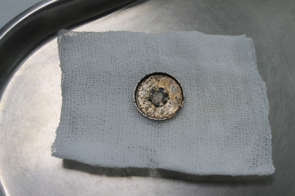 Trước đó, lúc 22h ngày 29-5, bệnh nhân Đoàn Bảo Giang được người nhà đưa đến khám bệnh do bị nuốt dị vật vào đường tiêu hóa. Kết quả nội soi cho thấy vùng hang vị dạ dày của bệnh nhân có 1 dị vật hình tròn bằng kim loại, đường kính 1,2cm, rìa mỏng kèm gai nhọn ở trung tâm dị vật; niêm mạc bờ cong nhỏ phù nề sung huyết do dị vật nằm trong dạ dày.