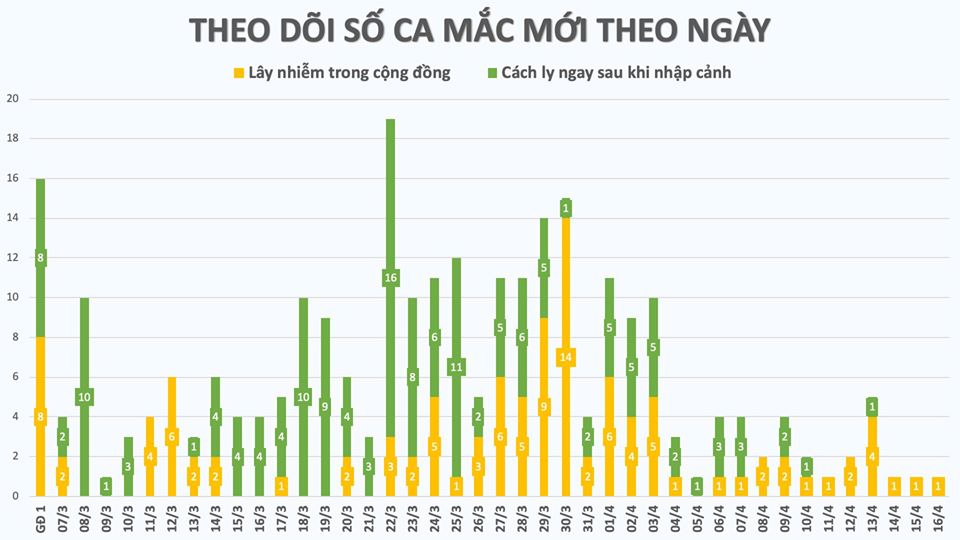 Trong 14 ngày vừa qua kể từ khi thực hiện Chỉ thị số 16 của Thủ tướng Chính phủ về thực hiện cách ly xã hội, 3 ngày đầu tiên (01-03/4) ghi nhận 30 trường hợp mắc mới, sau đó chỉ ghi nhân số mắc mới trong khoảng từ 1-5 trường hợp mỗi ngày.
