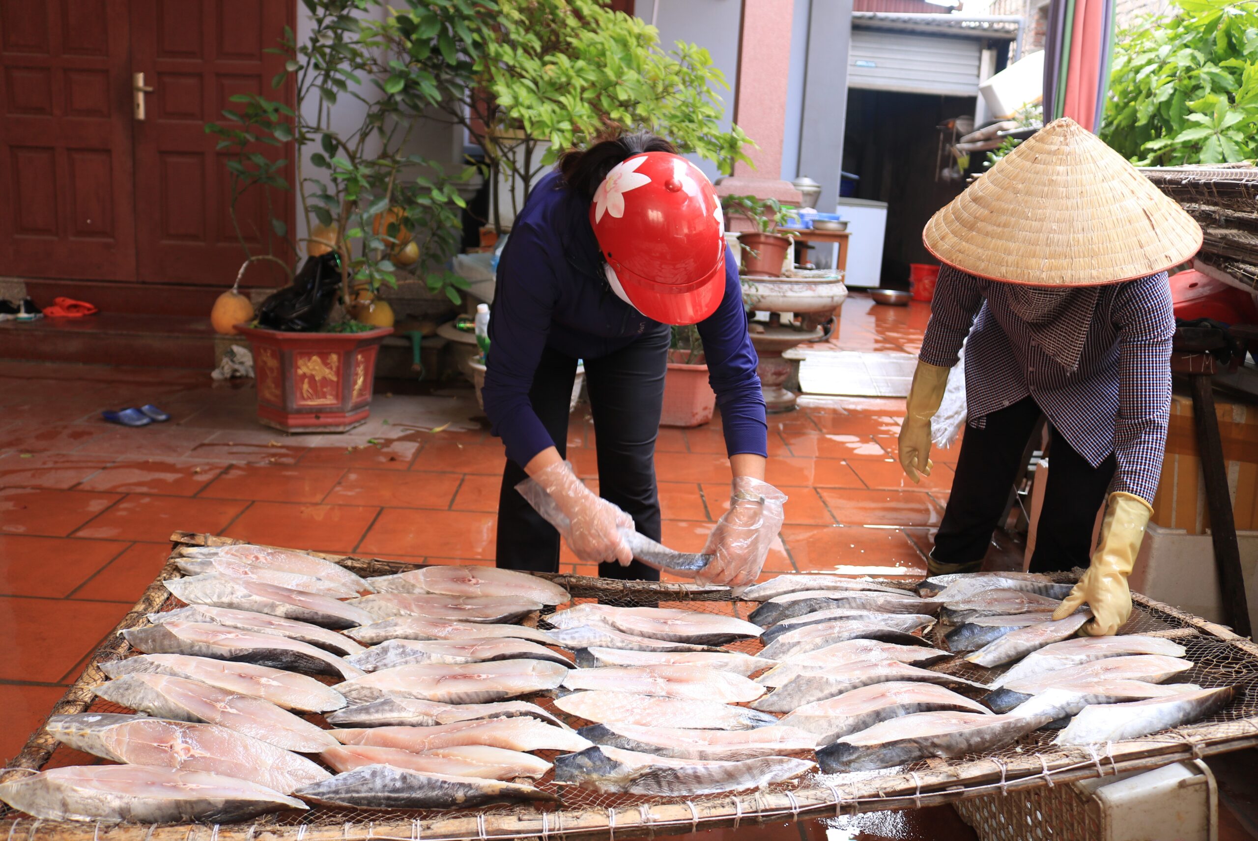 Có mặt tại xưởng sản xuất rộng gần 100m² của gia đình chị Lưu Thị Tuyết, Chủ nhiệm CLB chế biến hải sản phường Hải Sơn, Phó chủ nhiệm CLB sản xuất – kinh doanh giỏi quận Đồ Sơn, các nhân công đang thoăn thoắt đôi tay chế biến mẻ cá thu một nắng mới. Những con cá thu tươi ngon, nặng khoảng 5-7kg/con trở lên đã được đánh vẩy, cắt khúc và ngâm nước muối loãng. Theo lời các nhân công ở đây, người dân Đồ Sơn vốn có truyền thống chế biến cá khô bằng muối mặn, phơi nắng kỹ cho kiệt nước.