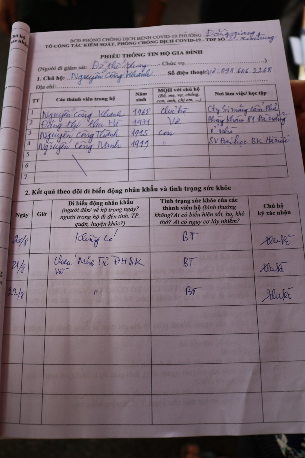 Hàng ngày các thành viên tổ công tác đến từng nhà để giám sát di biến động dân cư, tăng cường nắm bắt, quản lý những người đi làm ăn xa trở về địa phương và có ký xác nhận vào cuối ngày.