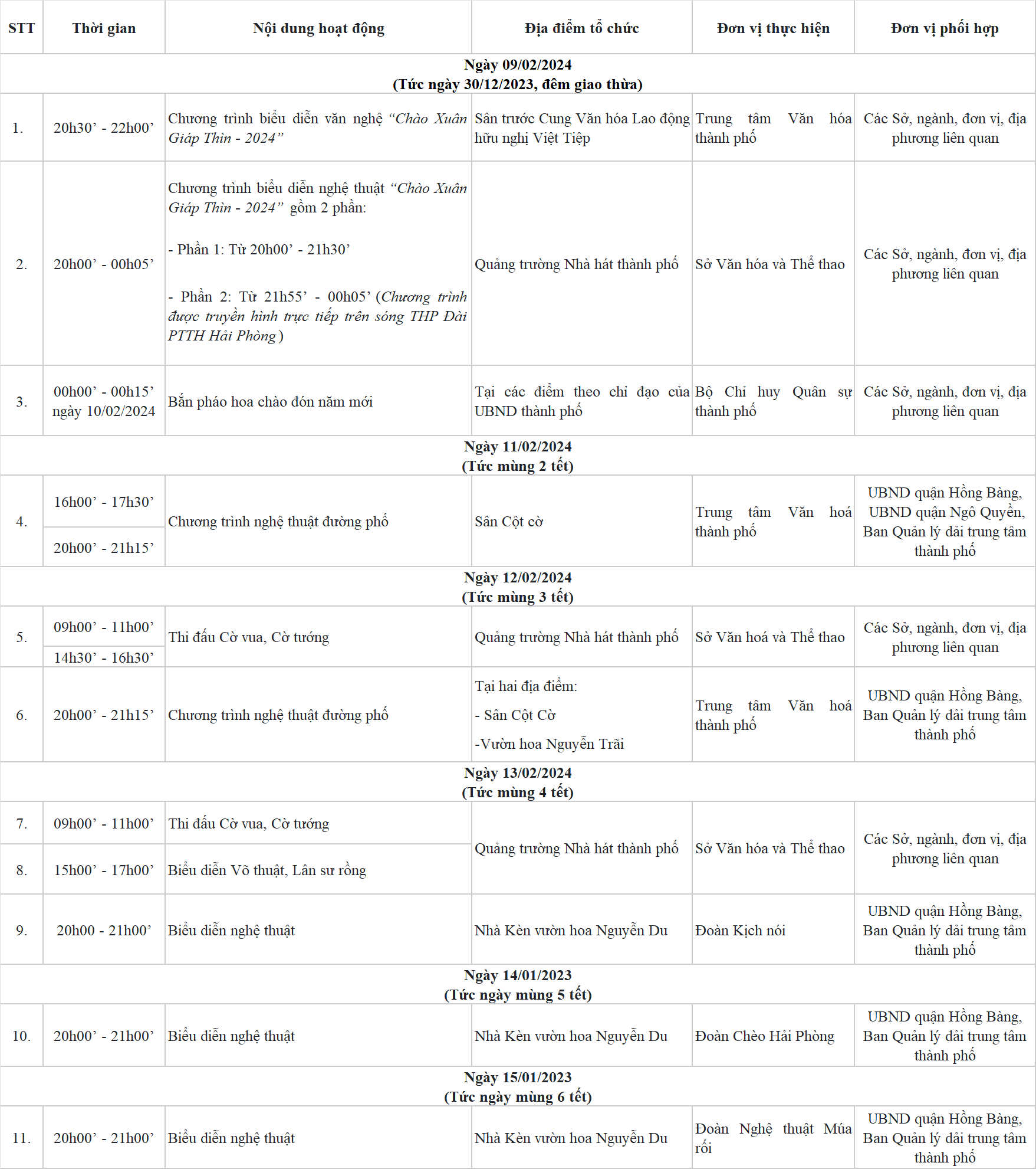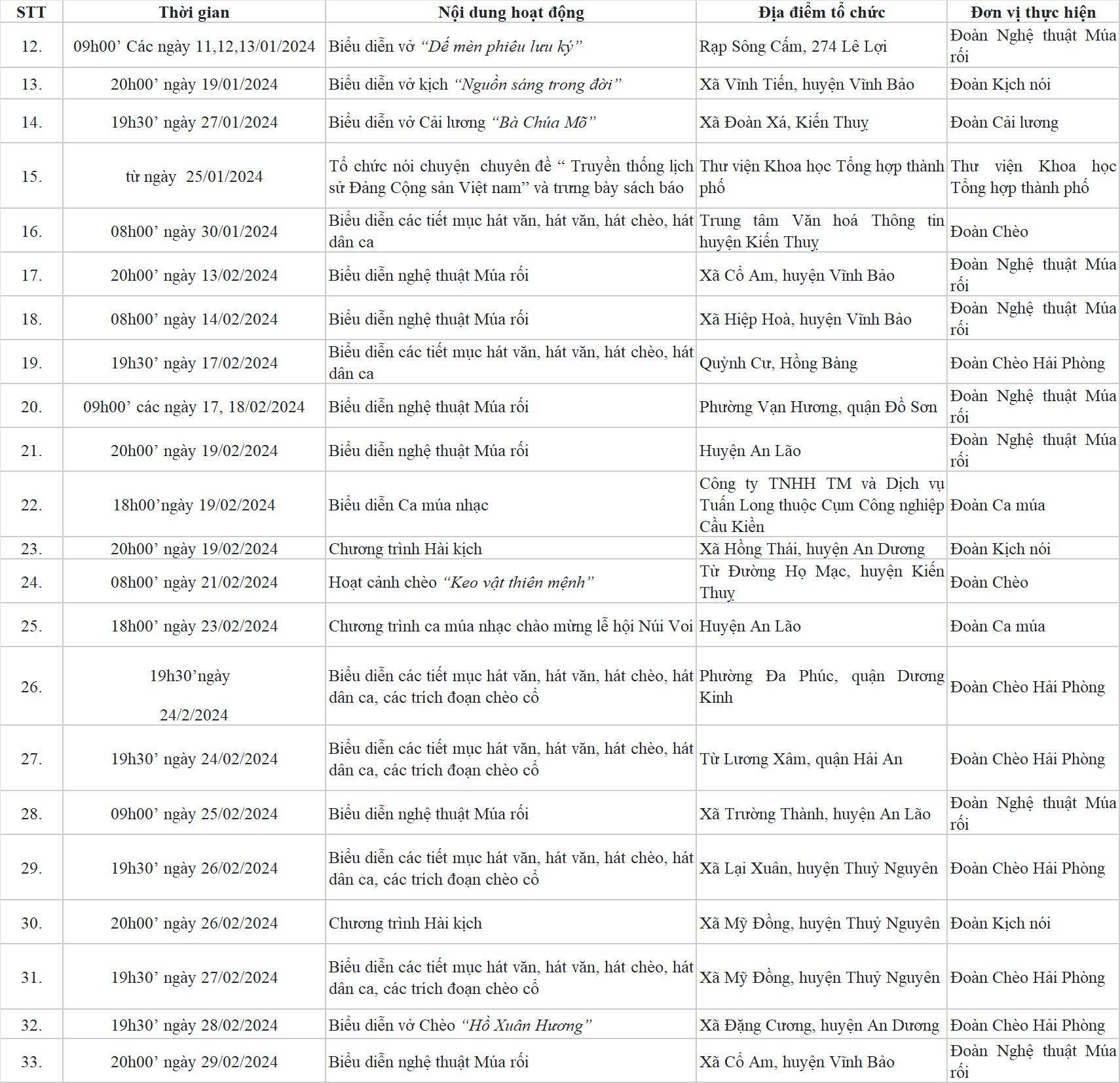 Sở Văn hóa và Thể thao Hải Phòng thông tin về các hoạt động biểu diễn nghệ thuật, thể dục thể thao phục vụ nhân dân trong dịp Tết Nguyên đán Giáp Thìn năm 2024.