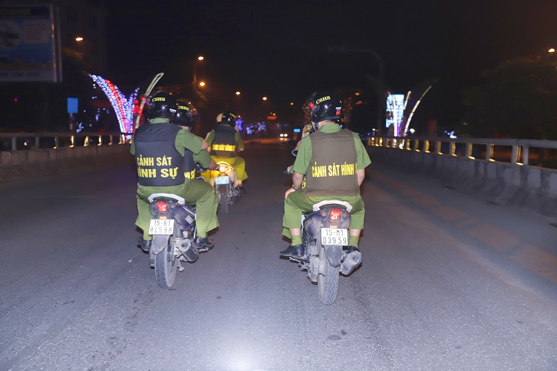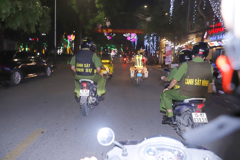 Đúng 22h đêm 5-5, lực lượng tuần tra vũ trang với 64 CBCS, được chia làm 2 tổ công tác, trong đó tổ 1 tuần tra các tuyến đường trên địa bàn các quận Ngô Quyền và Hải An; tổ 2 tuần tra các tuyến đường trên địa bàn quận Hồng Bàng và huyện An Dương.