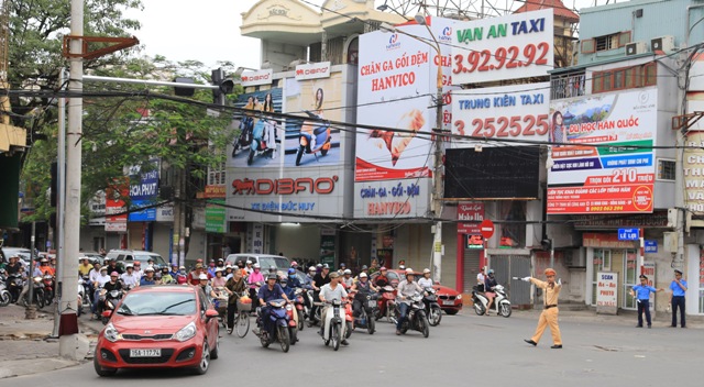 Lực lượng chức năng tích cực điều tiết, hướng dẫn người dân tham gia giao thông tại nút giao ngã 4 Thành Đội với đường Lê Lợi. Ảnh: Tiến Phước