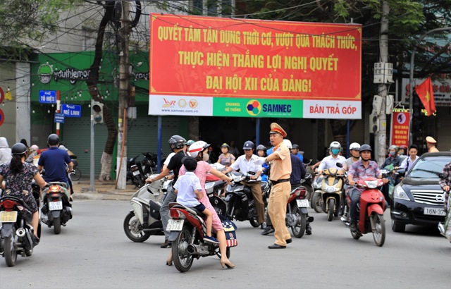 Các phương tiện thông tin truyền thông thời gian qua đã đẩy mạnh tuyên truyền về việc lập lại trật tự an toàn giao thông, trật tự đô thị trên địa bàn thành phố. Các băng – rôn tuyên truyền về sơ đồ phân luồng và nội dung phân luồng được lắp đặt tại các nút giao thông để người dân nắm được thông tin. Ảnh: Tiến Phước