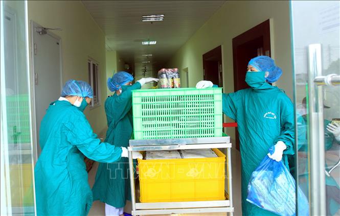 Các y, bác sĩ mang cơm đến tận từng phòng. Ảnh: An Đăng/TTXVN.
