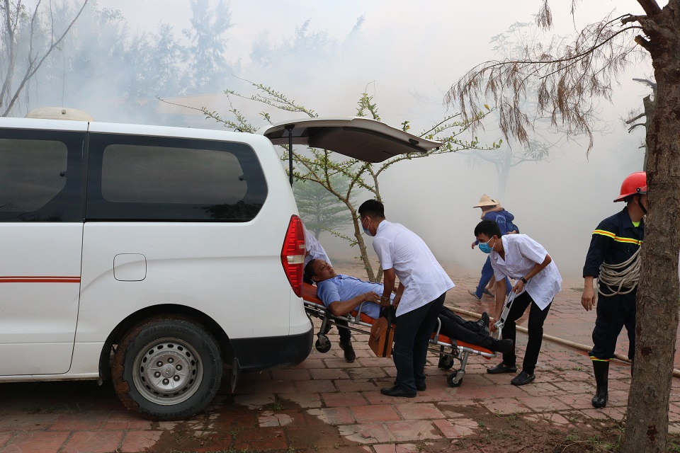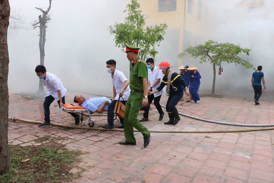 Cùng với đó, lực lượng chữa cháy chuyên nghiệp của Công an huyện Tiên Lãng đã điều động 2 xe chuyên dụng nhanh chóng tiếp cận hiện trường, triển khai phương án chữa cháy, sử dụng lăng vòi phun dập khoanh vùng, làm mát đám cháy; dùng xe thang cùng CBCS với trang bị mặt nạ phòng độc, quần áo bảo hộ phối hợp với tổ trinh sát nắm tình hình đám cháy, số người còn mắc kẹt trong đám cháy; 1 xe cứu thương của Bệnh viện đa khoa huyện, cùng các y, bác sỹ cũng được điều động đến ứng cứu các nạn nhân… Sau ít phút triển khai thực tập, đám cháy giả định đã được dập tắt, bảo đảm an toàn, đúng các yêu cầu kỹ thuật đề ra.