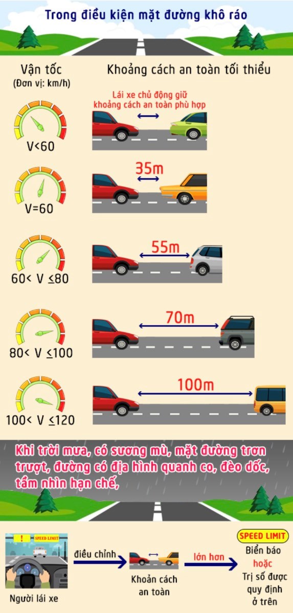 Người lái xe, người điều khiển xe máy chuyên dùng phải tuân thủ quy định về tốc độ xe chạy trên đường và phải giữ một khoảng cách an toàn đối với xe chạy liền trước xe của mình; ở nơi có biển báo “Cự ly tối thiểu giữa hai xe” phải giữ khoảng cách không nhỏ hơn trị số ghi trong biển báo.