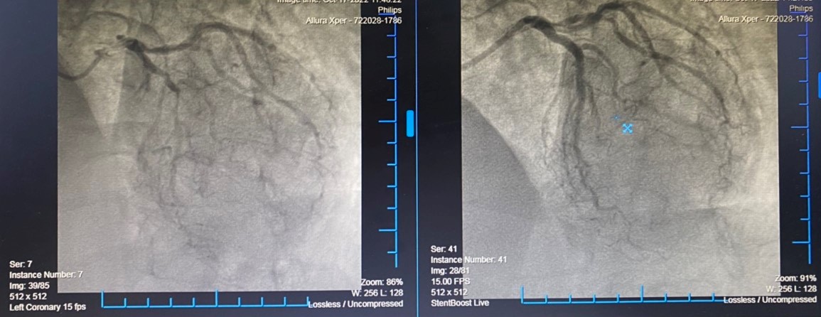 Sau khi đã hội chẩn và thống nhất các phương án điều trị, xác định thủ phạm chính gây nhồi máu cơ tim cấp lần này là Động mạch vành bên trái vị trí thân chung và hẹp khít LAD2, bệnh nhân được can thiệp đặt 2 Stent LM-LAD2. Ekip can thiệp đã rất thận trọng, tiến hành mở thông hoàn toàn thân chung động mạch vành trái, đặt 2 stent thành công. Quá trình can thiệp thuận lợi, sau can thiệp, bệnh nhân đã hết đau ngực, khó thở và hồi phục tốt.