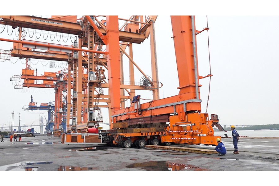 Cần trục dàn đang được lắp đặt tại cầu tàu chi nhánh Tân Vũ.
