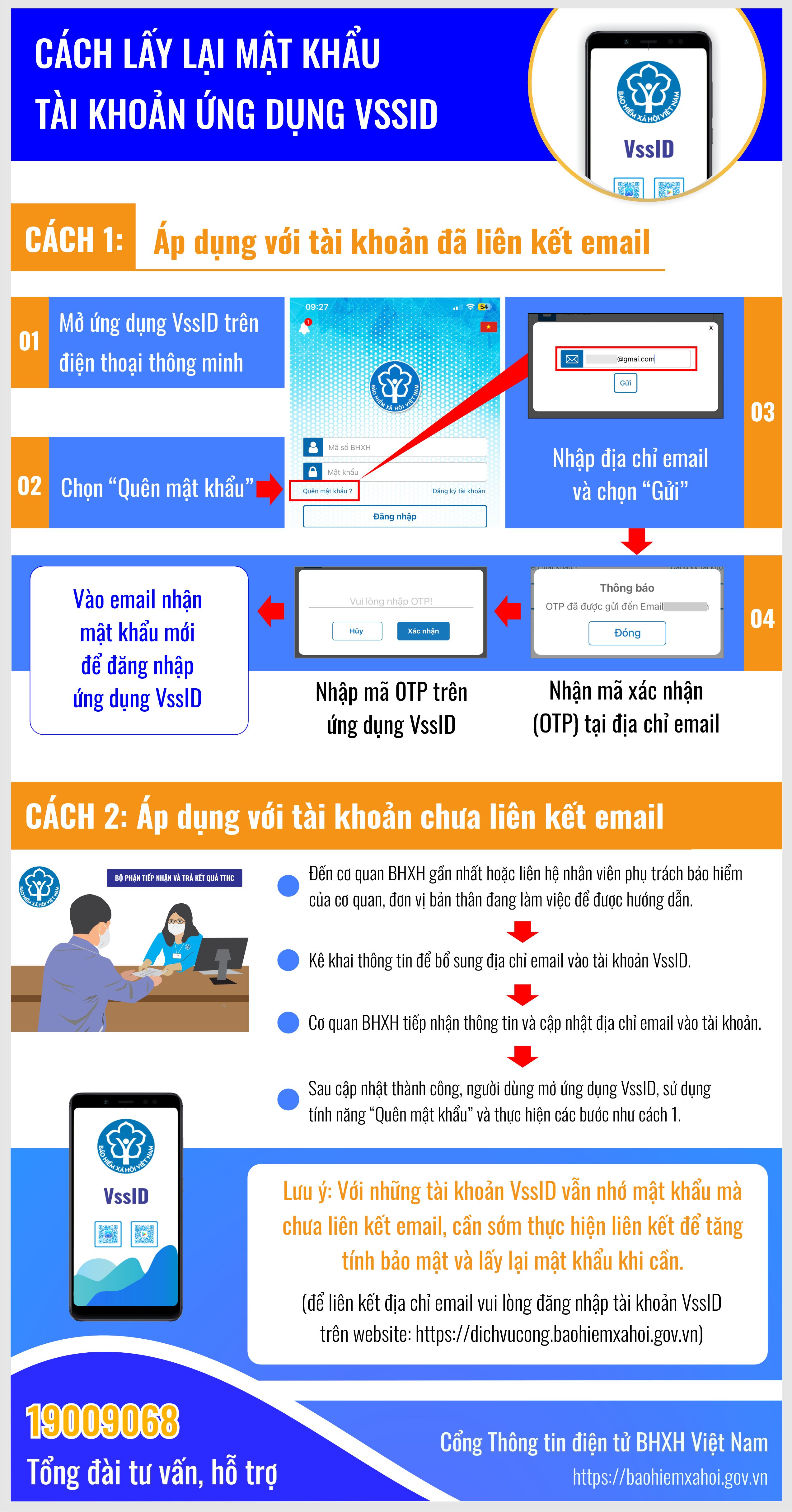 Việc cấp lại mật khẩu tài khoản giao dịch BHXH điện tử qua chức năng “Quên mật khẩu” trên ứng dụng VssID hoặc Cổng DVC BHXH Việt Nam (mật khẩu sẽ được cung cấp qua địa chỉ email mà người dân kê khai khi đăng ký tài khoản giao dịch BHXH điện tử). Trường hợp khi đăng ký tài khoản VssID nhưng chưa có thông tin về địa chỉ email, người dân có thể bổ sung địa chỉ email qua các kênh sau: Thực hiện việc lập Tờ khai TK1-TS để kê khai bổ sung thông tin email thông qua giao dịch BHXH điện tử của đơn vị, tổ chức dịch vụ thu đang quản lý hoặc thực hiện lập tờ khai thay đổi, bổ sung thông tin đăng ký sử dụng phương thức giao dịch điện tử trong lĩnh vực BHXH theo Mẫu số 02/SĐ-GD, đến nộp trực tiếp tại cơ quan BHXH nơi gần nhất hoặc liên hệ trực tiếp tới Trung tâm Dịch vụ hỗ trợ, chăm sóc khách hàng qua số hotline 1900.9068 hoặc số 0243.7899999 (trong giờ hành chính) để được hỗ trợ./.