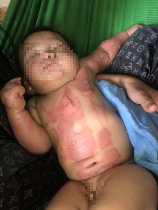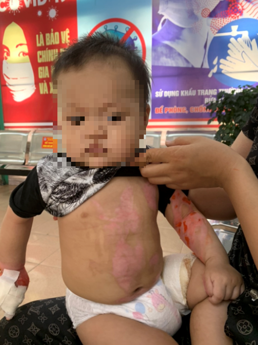 Bệnh nhi Nguyễn Trí K, 6 tháng tuổi, ở Tân Dương, huyện Thủy Nguyên bị bỏng do nước sôi đổ vào người, sau tai nạn, thân mình, 2 tay, đùi trái bị vết bỏng phồng bọng nước lớn, trợt da, đỏ da. Bệnh nhân đã tìm đến thầy lang gần nhà để điều trị bằng cách đắp thuốc nam. Tuy nhiên bệnh không khỏi mà vùng bỏng sưng nề, tấy đỏ có vết loét rộng, chảy dịch mủ và dính nhiều loại thuốc màu đen trên bề mặt vết bỏng, tình trạng mỗi lúc một nặng nên được người nhà đưa đến bệnh viện điều trị.