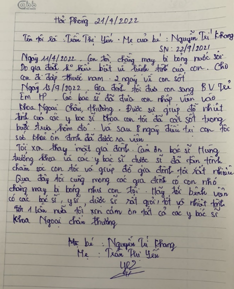 Dưới đây là lá thư tâm huyết của gia đình người bệnh dành cho các Y Bác sĩ khoa Ngoại Chấn thương nơi cháu bé chữa trị vết thương.