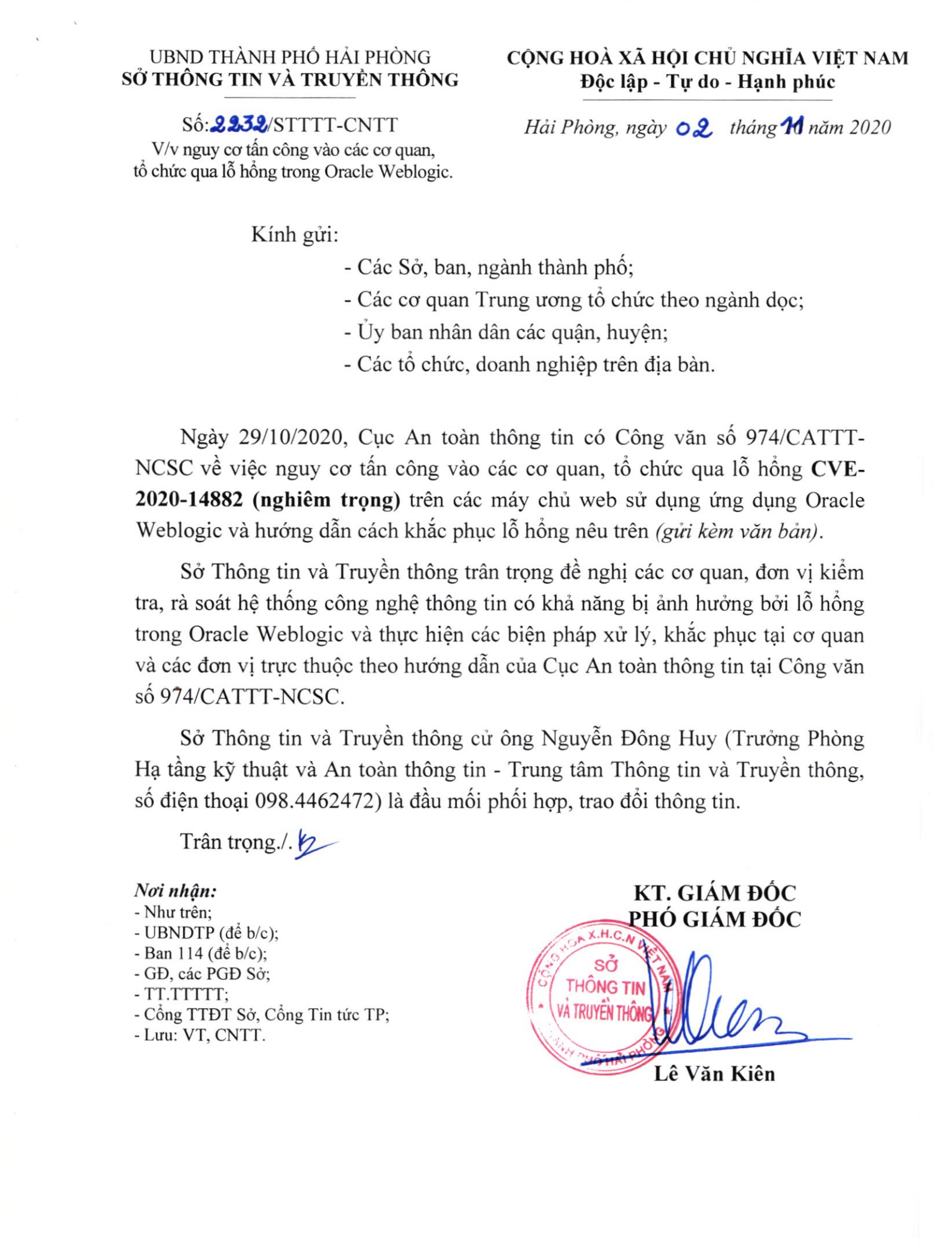 Thực hiện Công văn số 974/CATTT-NCSC ngày 29/10/2020 của Cục An toàn thông tin về việc nguy cơ tấn công vào các cơ quan tổ chức qua lỗ hổng trong Oracle Weblogic, hướng dẫn cách khắc phục lỗ hổng trên, Sở Thông tin và Truyền thông Hải Phòng vừa có văn bản đề nghị các cơ quan, đơn vị thực hiện kiểm tra, rà soát hệ thống công nghệ thông tin có khả năng bị ảnh hưởng bởi lỗ hổng trong Oracle Weblogic và thực hiện các biện pháp xử lý, khắc phục tại đơn vị và các cơ quan trực thuộc theo hướng dẫn.