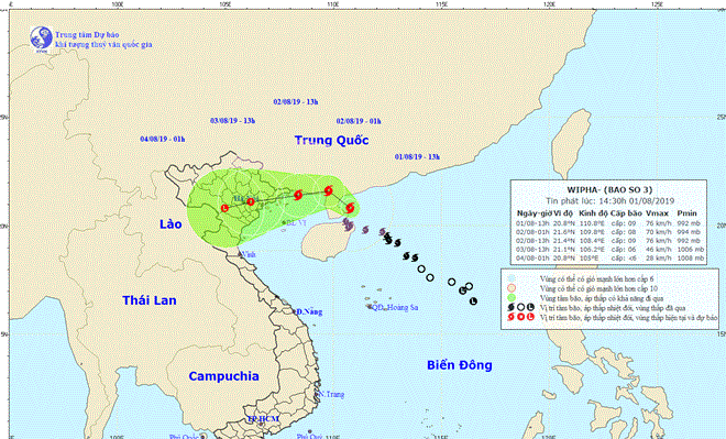 Theo thông tin từ Trung tâm Dự báo khí tượng thủy văn Trung ương, cơn bão số 3 (Wipha) dự kiến sẽ đổ bộ vào đất liền các tỉnh từ Quảng Ninh đến Thái Bình.
