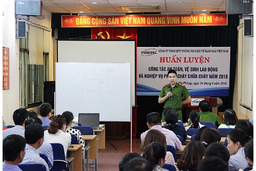 Tập huấn kiến thức và kỹ năng PCCC tại Công ty TNHH MTV Thông tin điện tử Hàng hải Việt Nam (VISHIPEL), ở phường Minh Khai (quận Hồng Bàng).