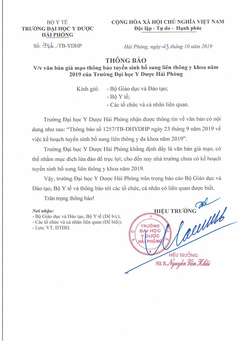 Ngày 23-10, Trường Đại học Y Dược Hải Phòng đã ban hành văn bản số 746/TB-YDHP gửi Bộ Giáo dục – Đào tạo và Bộ Y tế. Theo đó, Trường khẳng định “Thông báo về kế hoạch tuyển sinh bổ sung liên thông y khoa năm 2019” nói trên là văn bản giả mạo, có thể nhằm mục đích lừa đảo để trục lợi. Cho đến nay, nhà trường chưa có kế hoạch tuyển sinh bổ sung liên thông y khoa năm 2019.