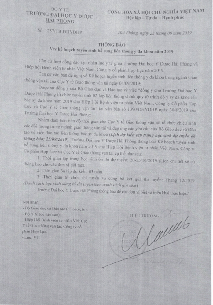 “Thông báo” này cho biết, căn cứ hợp đồng đào tạo nhân lực y tế giữa trường Đại học Y Dược Hải Phòng và Hiệp hội Bệnh viện tư nhân Việt Nam, Công ty Cổ phần Hợp Lực năm 2019 và căn cứ văn bản đề nghị tuyển sinh liên thông y khoa trong ngành Giao thông vận tải của Cục Y tế Giao thông vận tải ngày 4/9/2019, Trường thông báo kế hoạch tuyển sinh bổ sung liên thông y đa khoa năm 2019.
