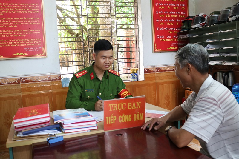 Thượng úy Nguyễn Văn Hoàng hướng dẫn người dân làm thủ tục đăng ký sổ hộ khẩu