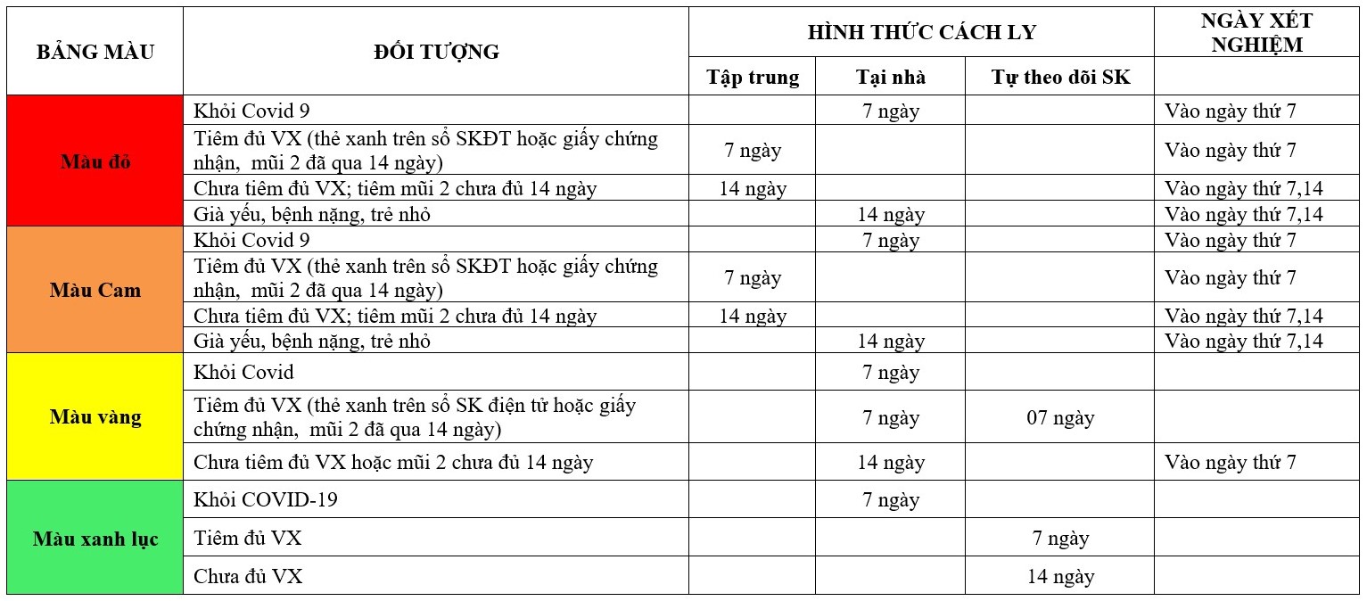+ Người đến từ vùng nguy cơ rất cao, nguy cơ cao (màu cam, màu vàng tại bảng màu phía dưới) thực hiện cách ly tại nhà 07 ngày, lấy mẫu xét nghiệm SARS-COV-2 bằng phương pháp RT-PCR vào ngày thứ 2 và ngày thứ 7.