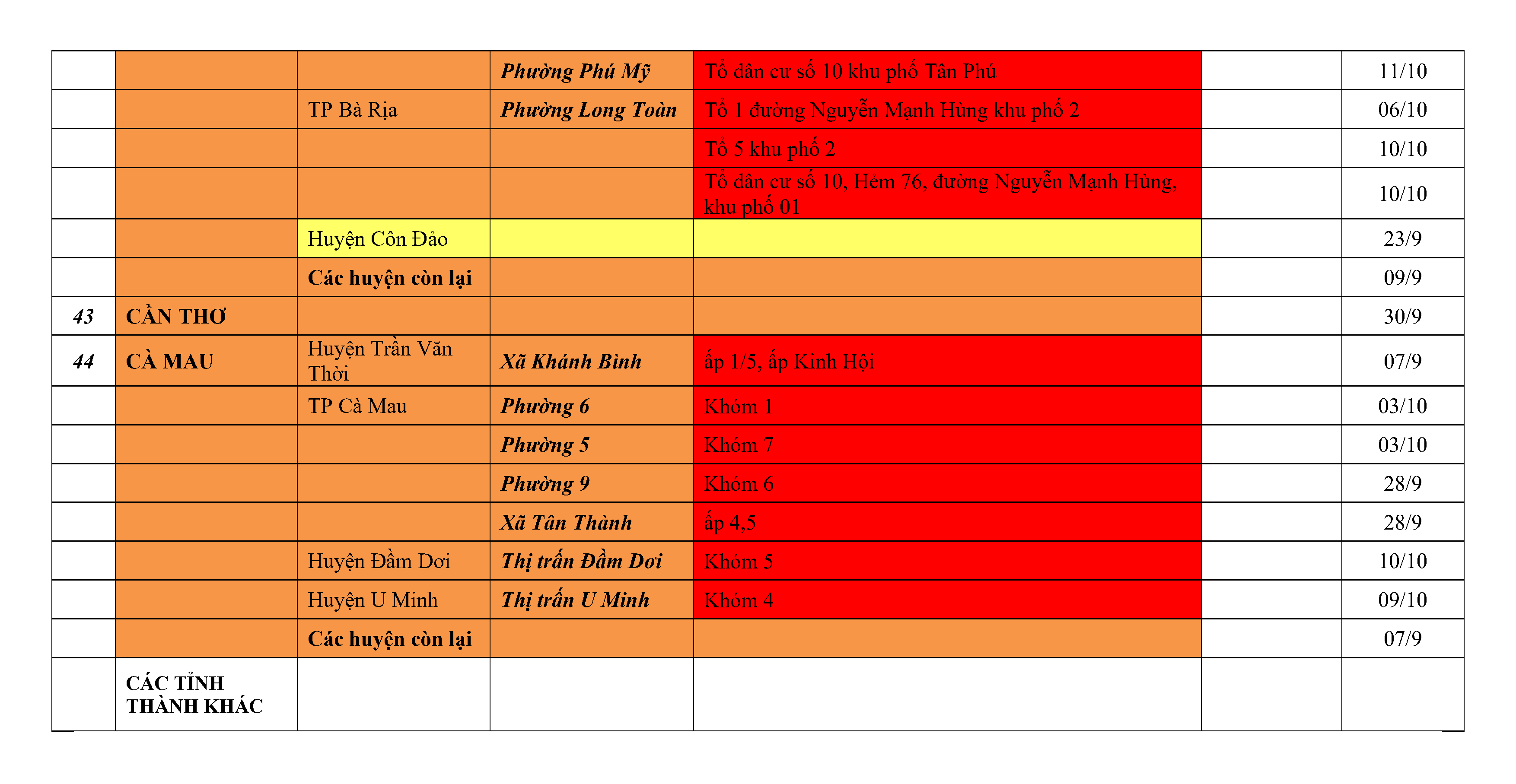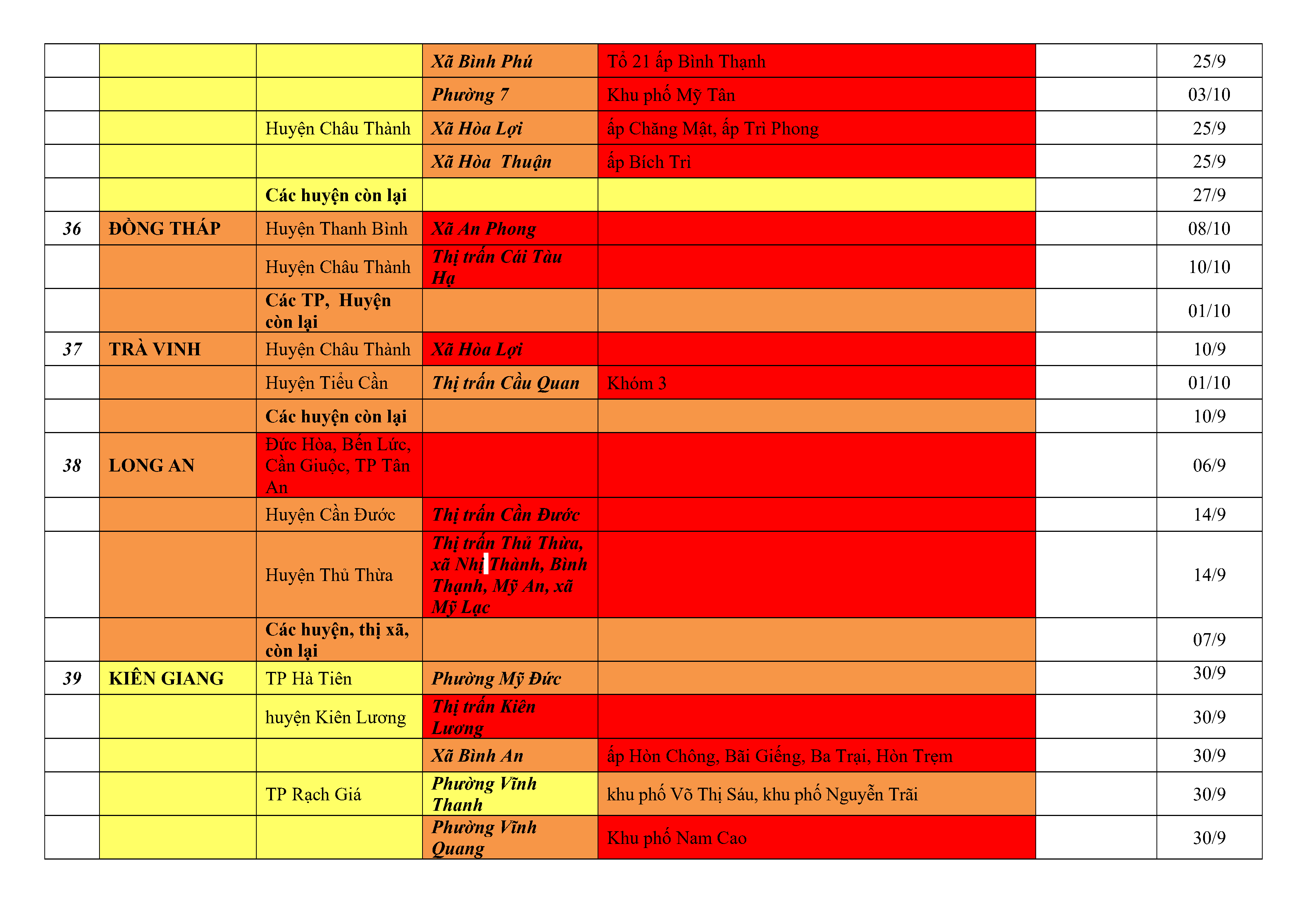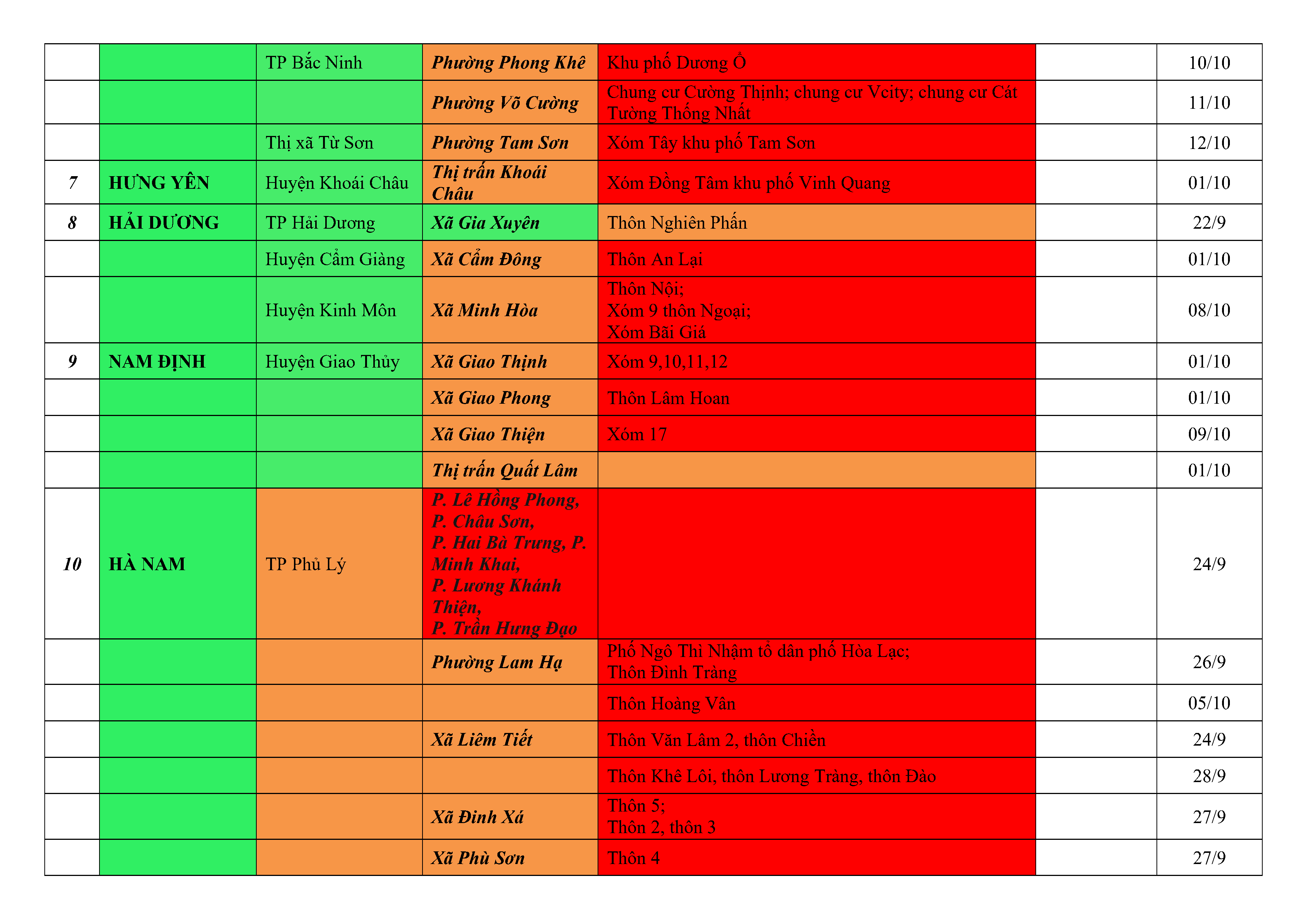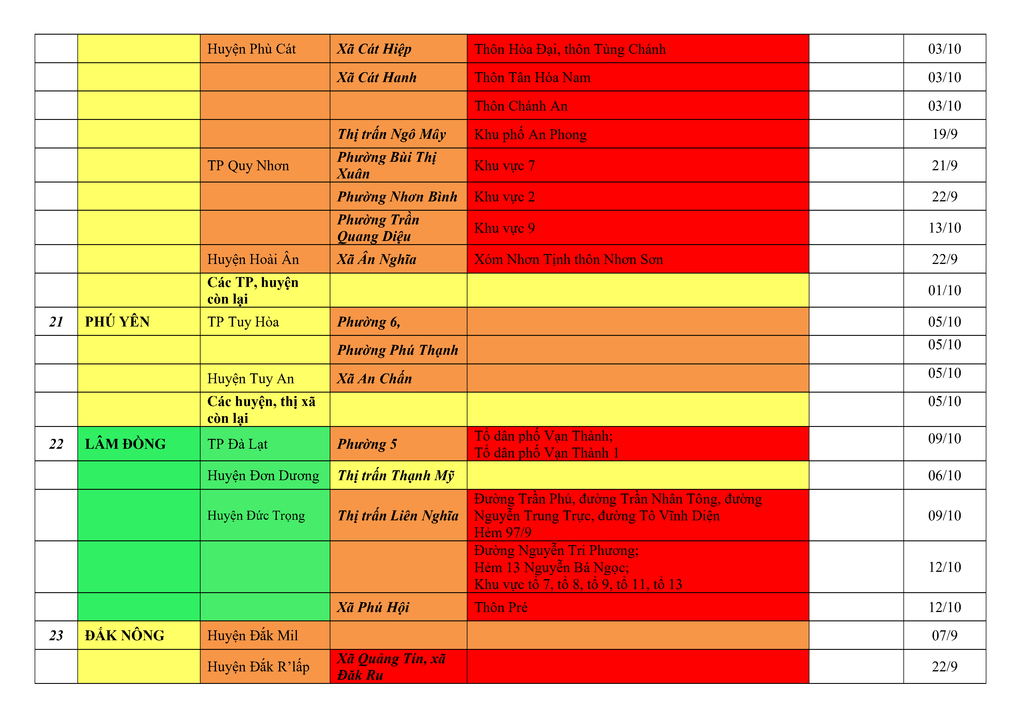 Lưu ý: các tỉnh, thành phố không có tên trong bảng màu, đi lại bình thường, tuân thủ các biện pháp phòng chống dịch theo chỉ đạo của Bộ Y tế; khai bào y tế, thực hiện nghiêm 5K.