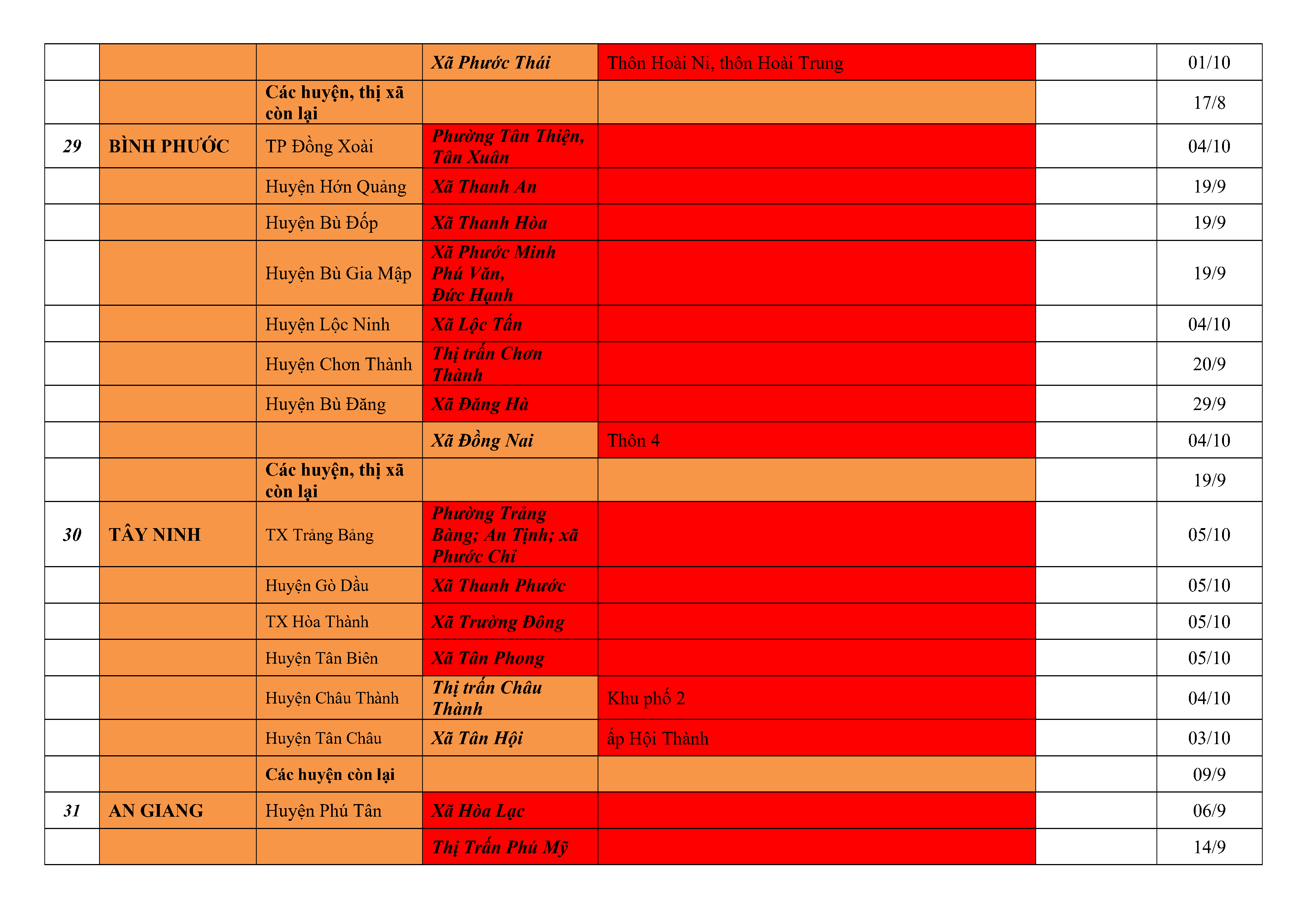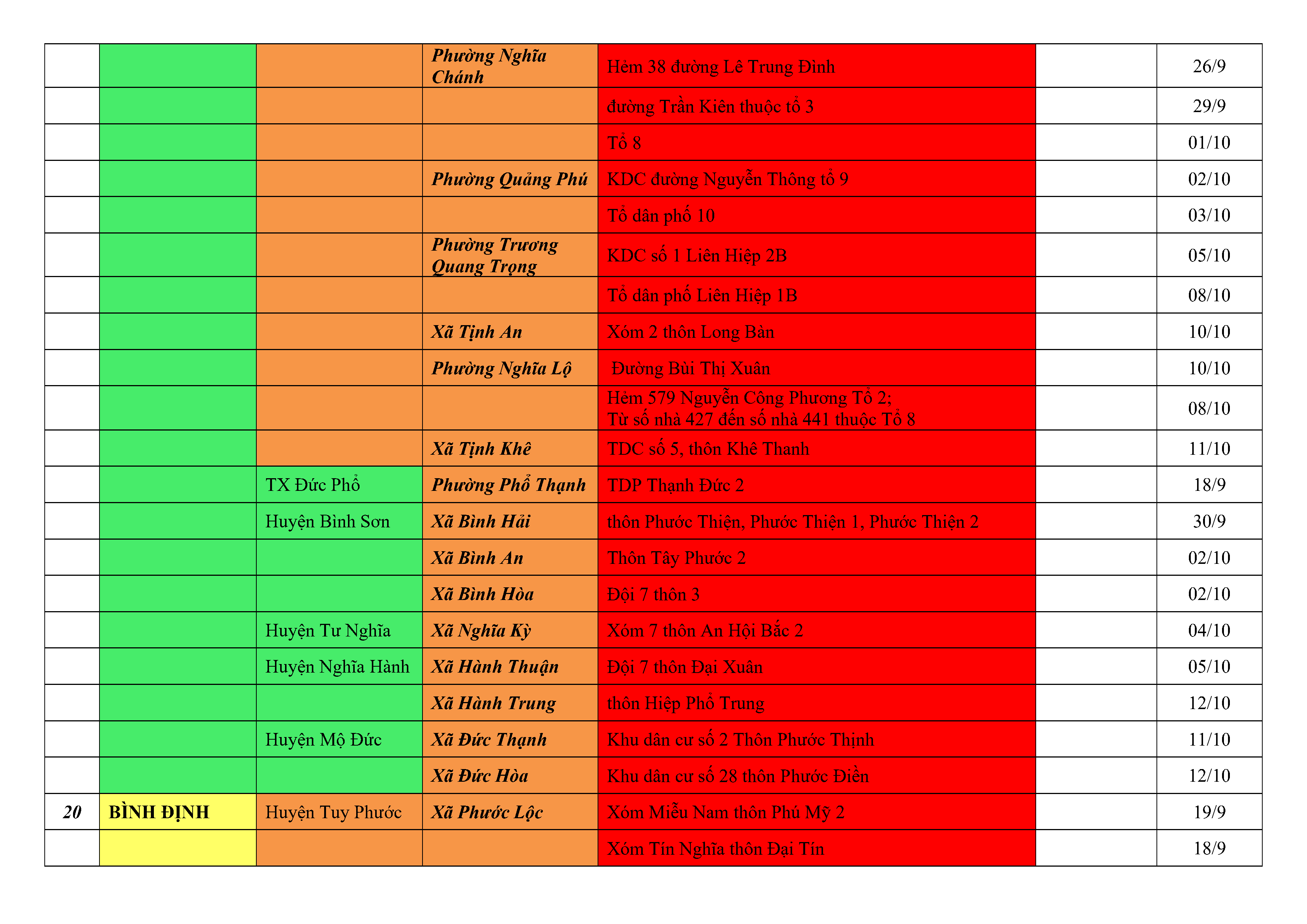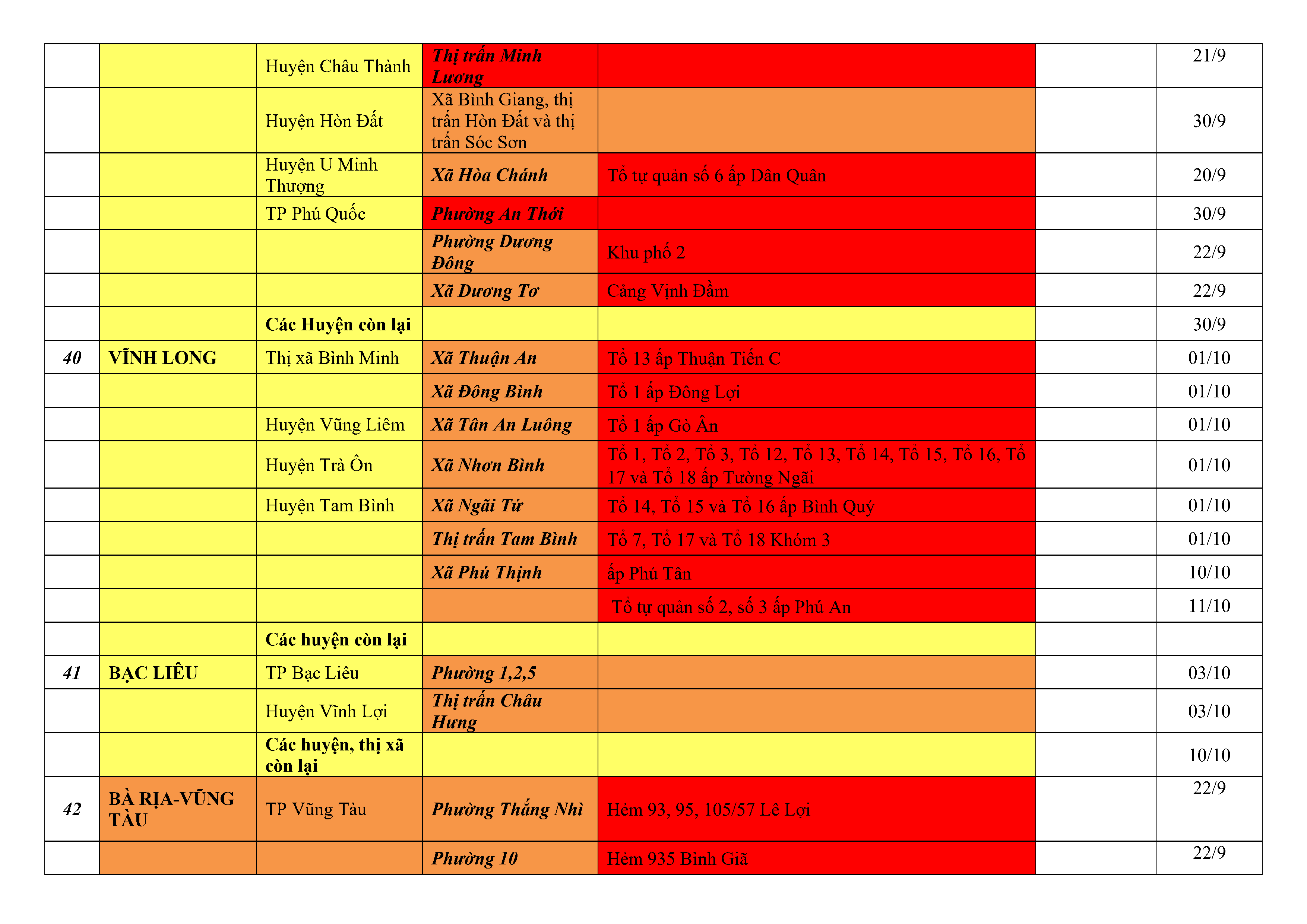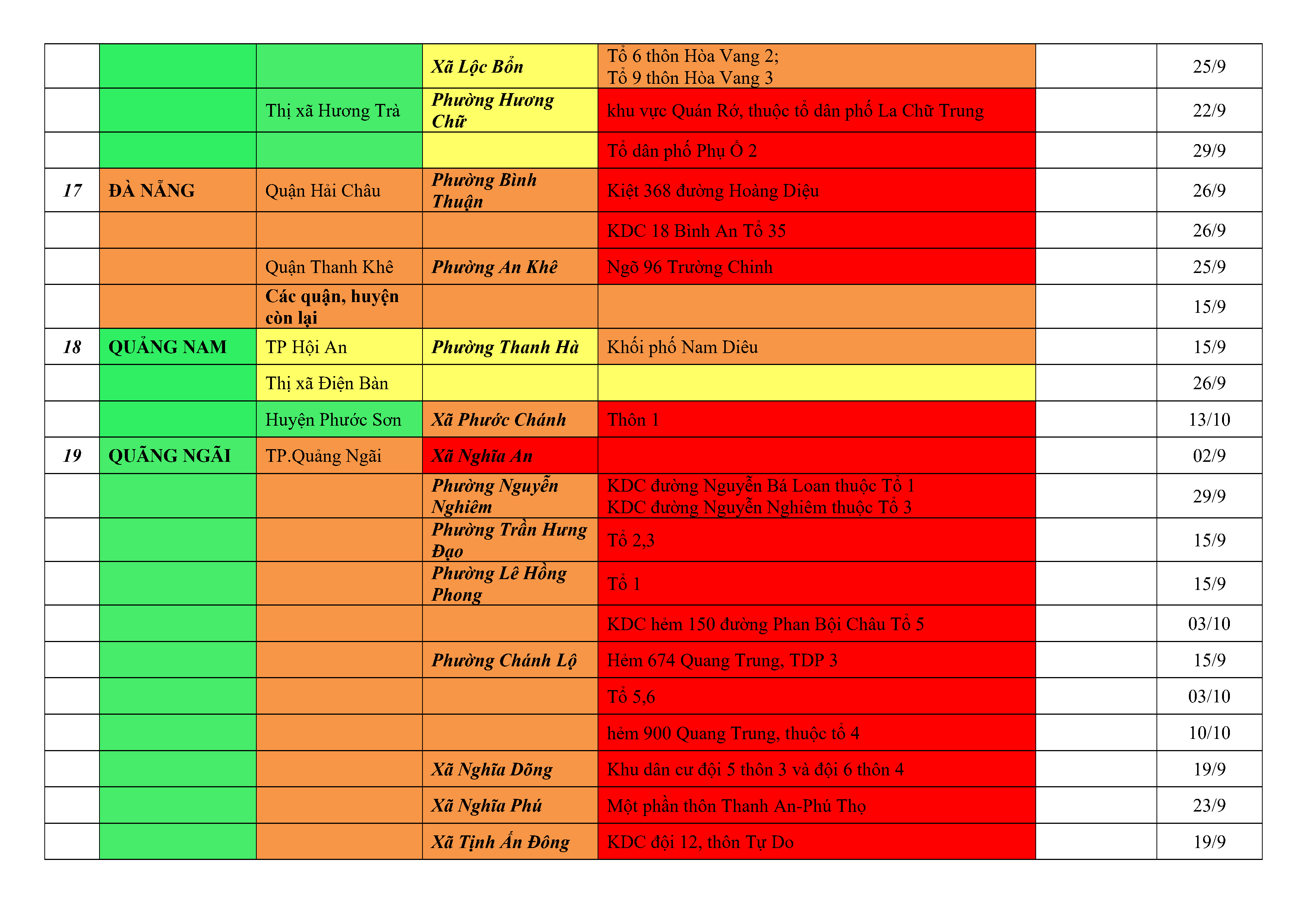 Lưu ý: các tỉnh, thành phố không có tên trong bảng màu, đi lại bình thường, tuân thủ các biện pháp phòng chống dịch theo chỉ đạo của Bộ Y tế; khai bào y tế, thực hiện nghiêm 5K.