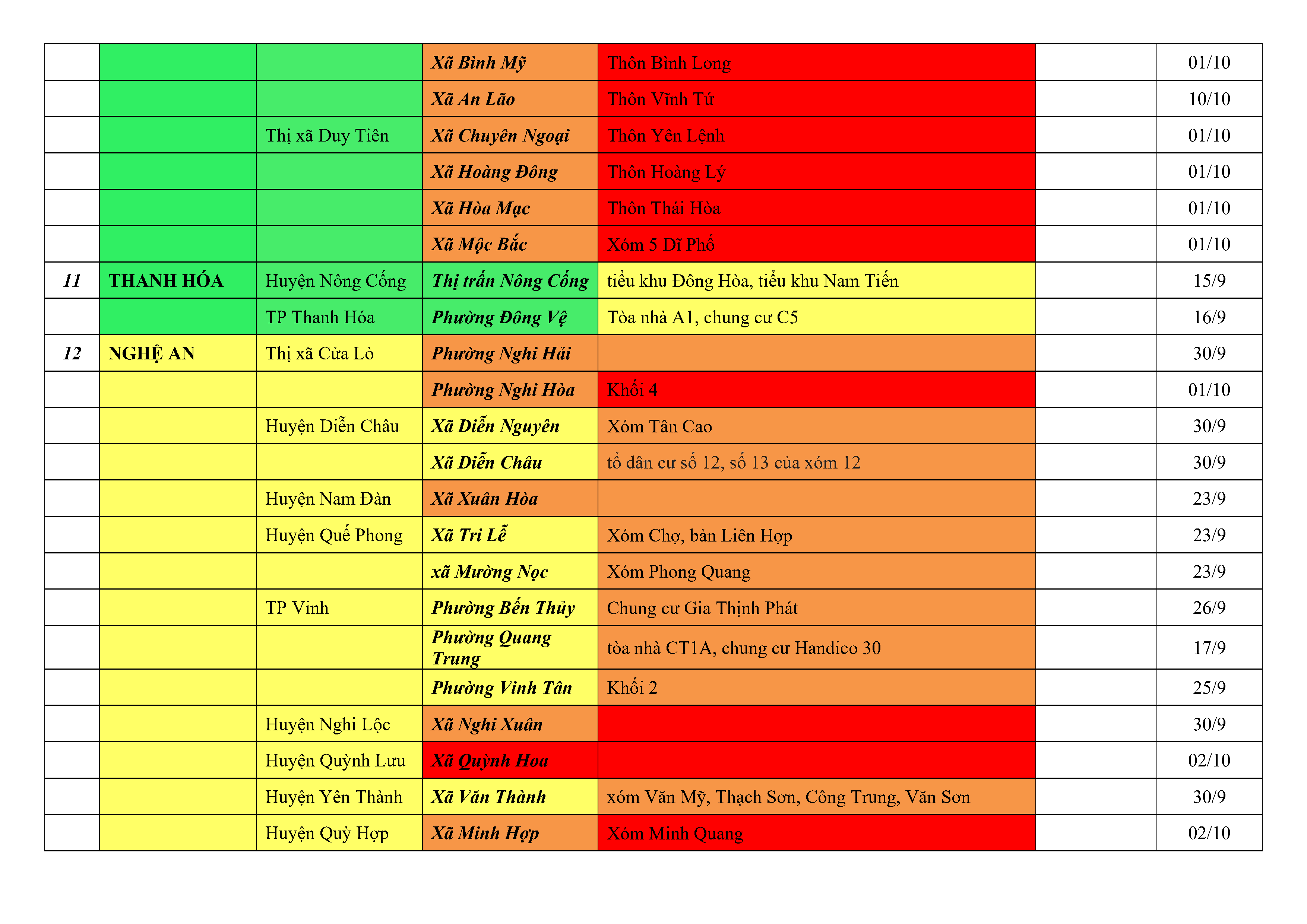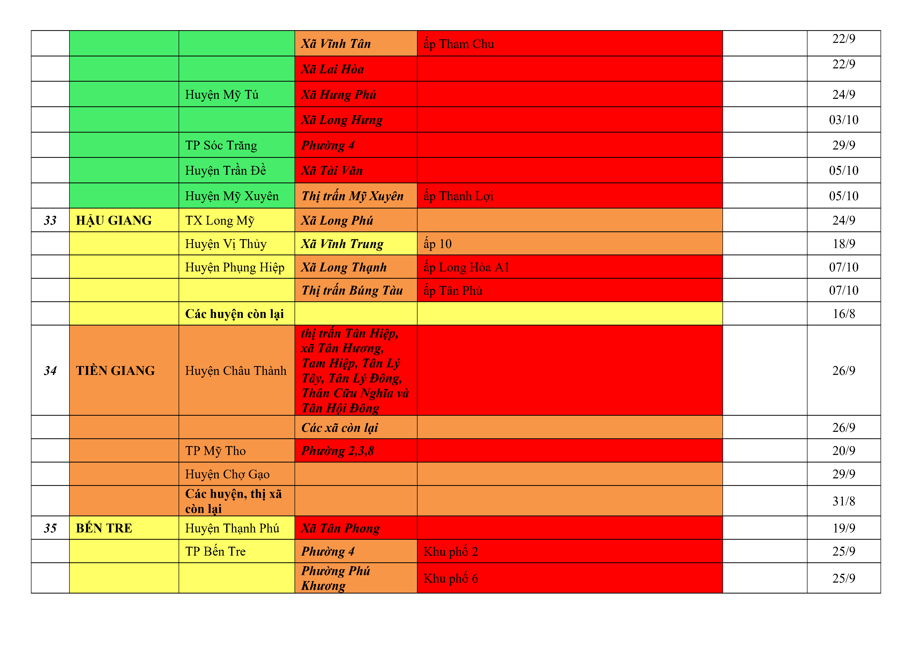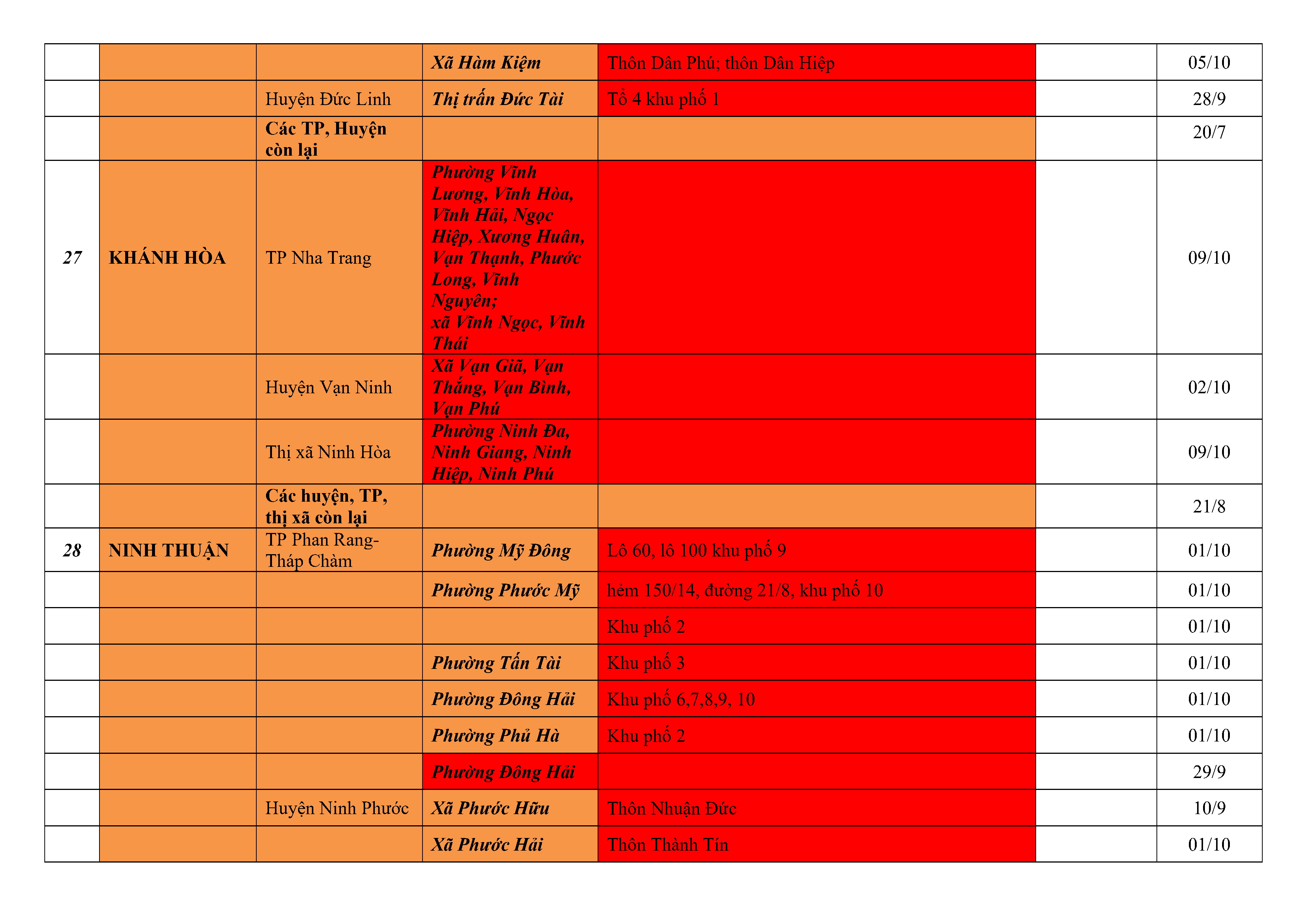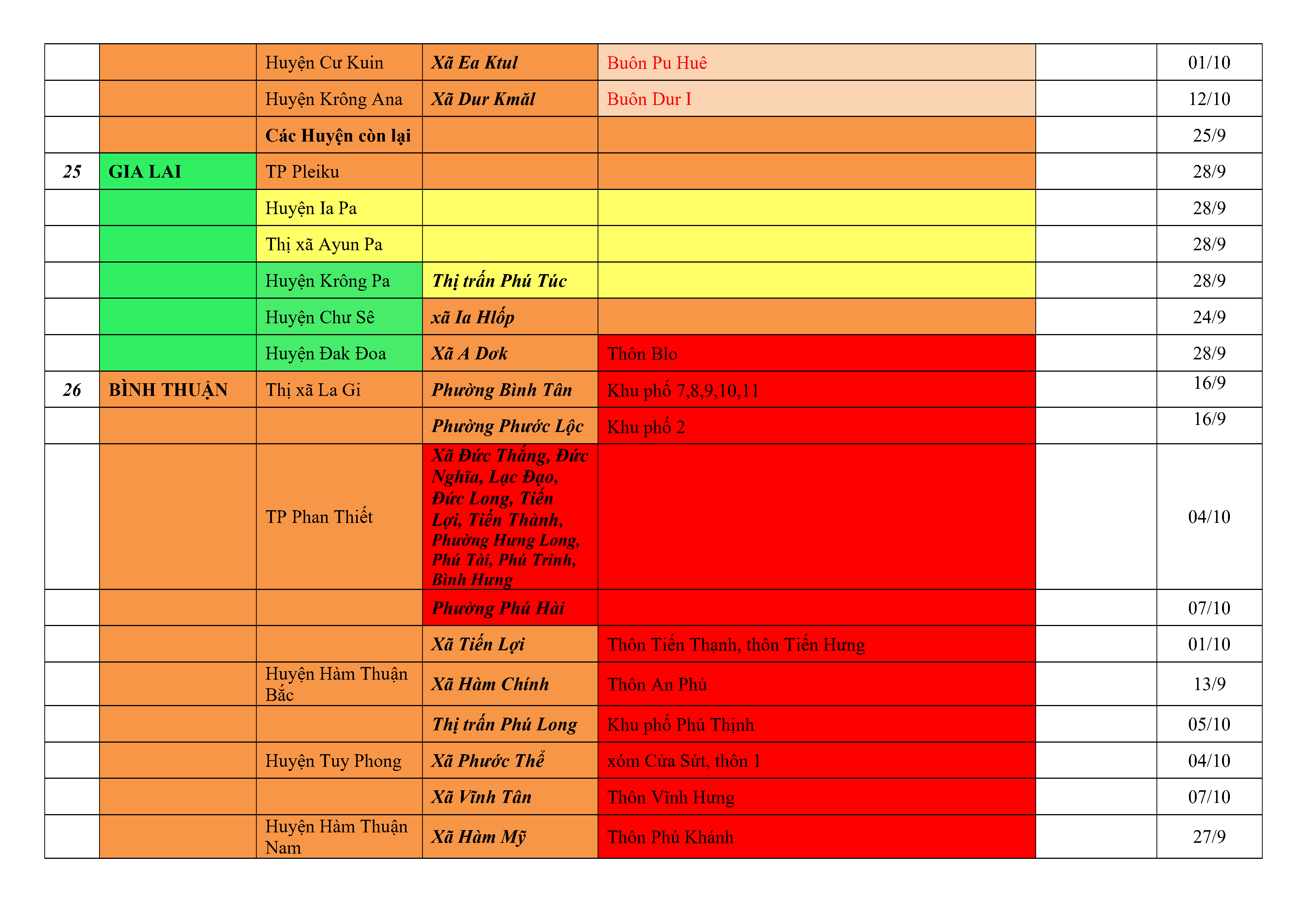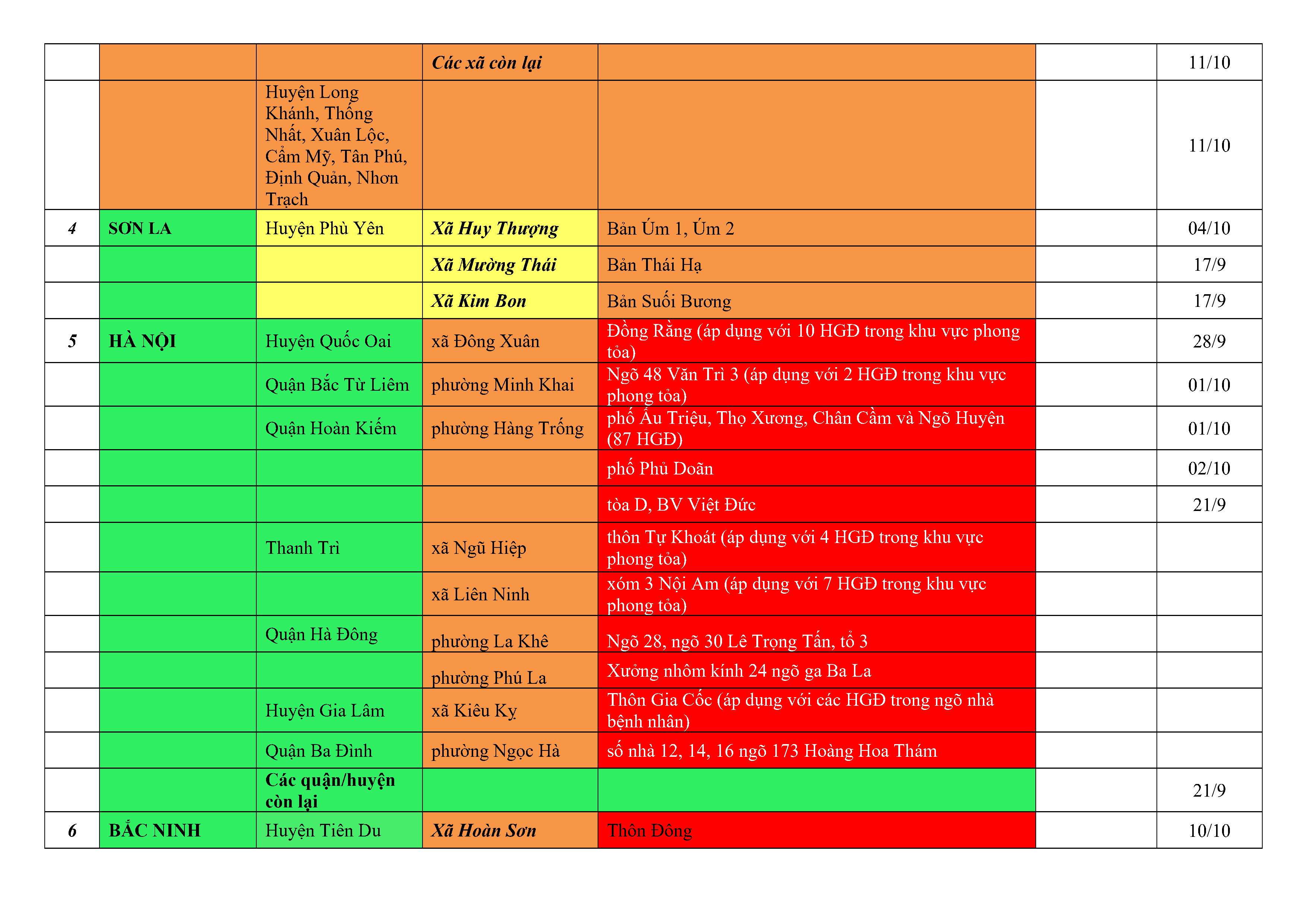 Lưu ý: các tỉnh, thành phố không có tên trong bảng màu, đi lại bình thường, tuân thủ các biện pháp phòng chống dịch theo chỉ đạo của Bộ Y tế; khai bào y tế, thực hiện nghiêm 5K.