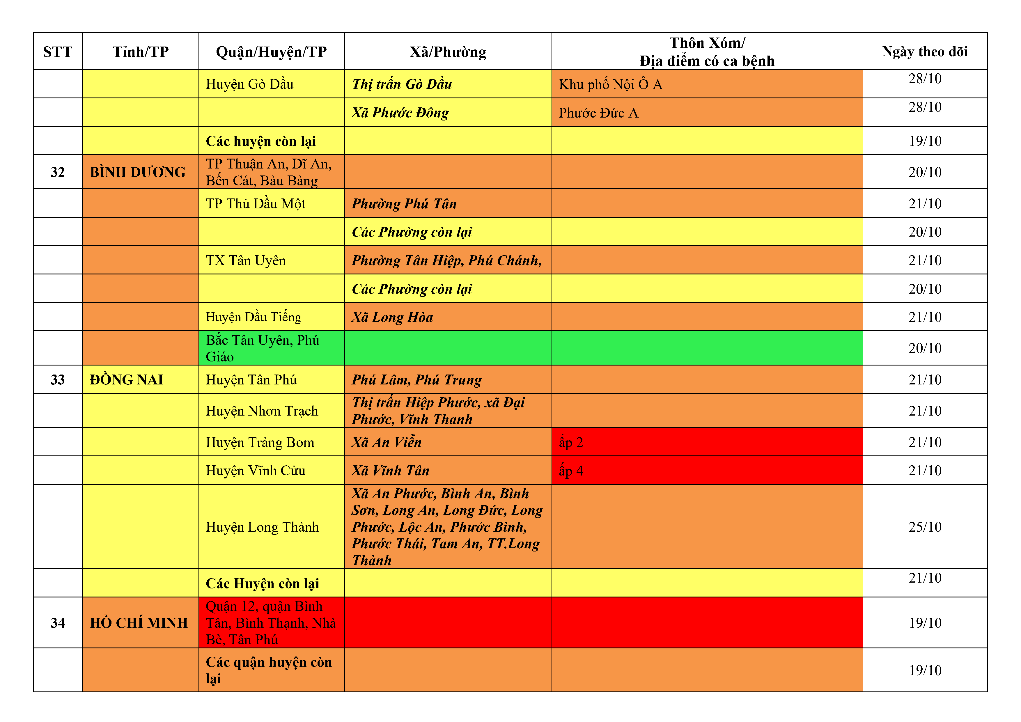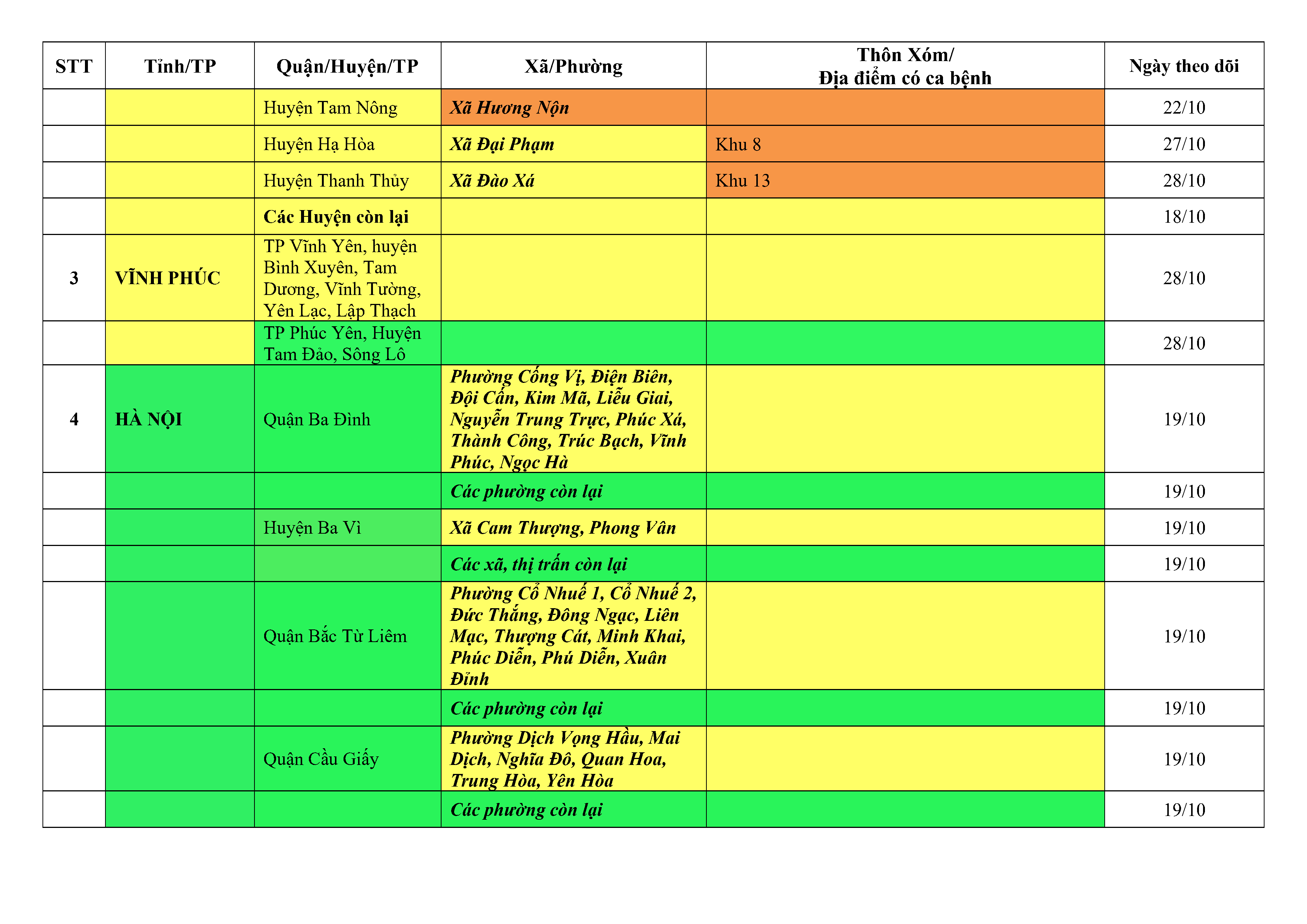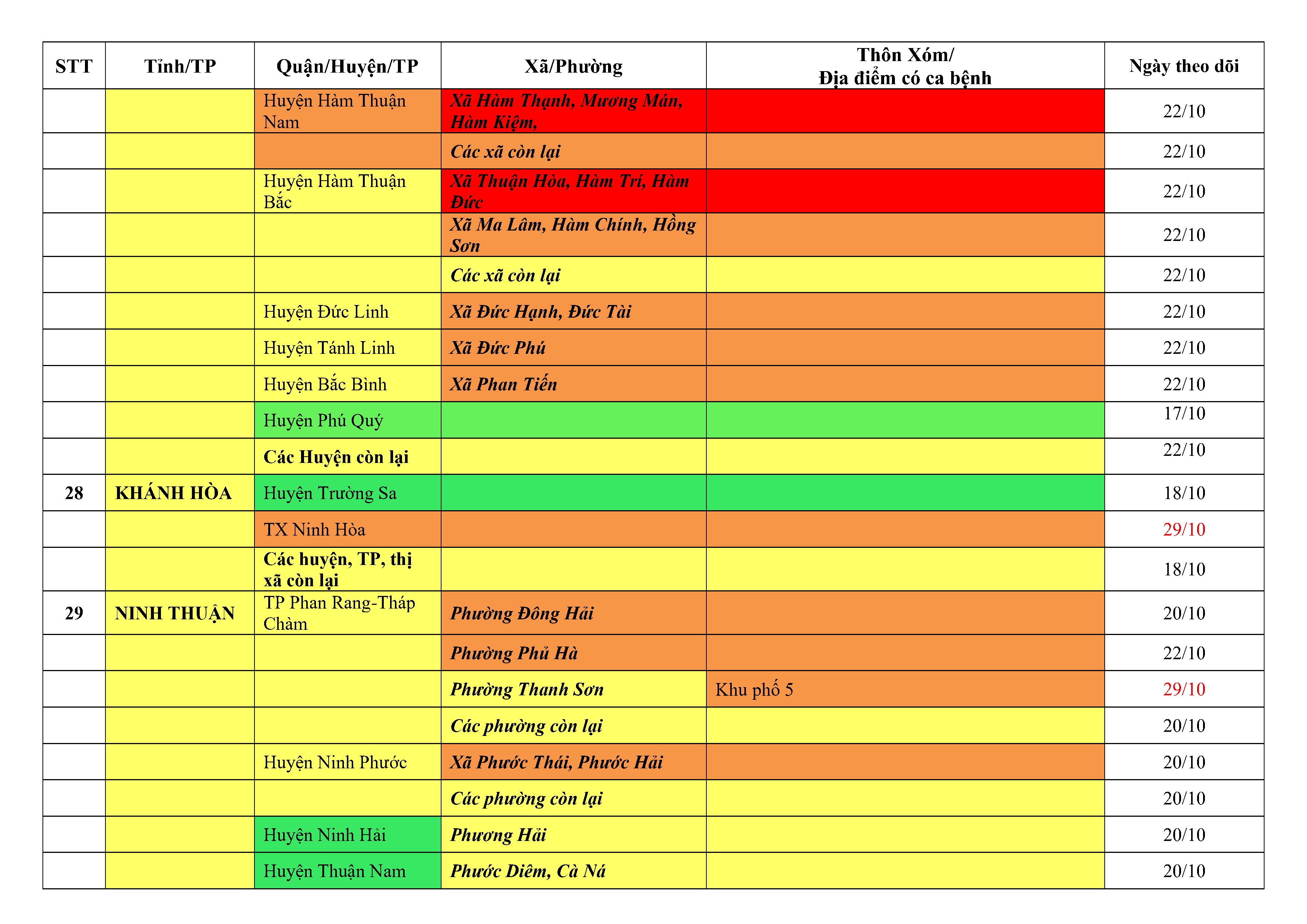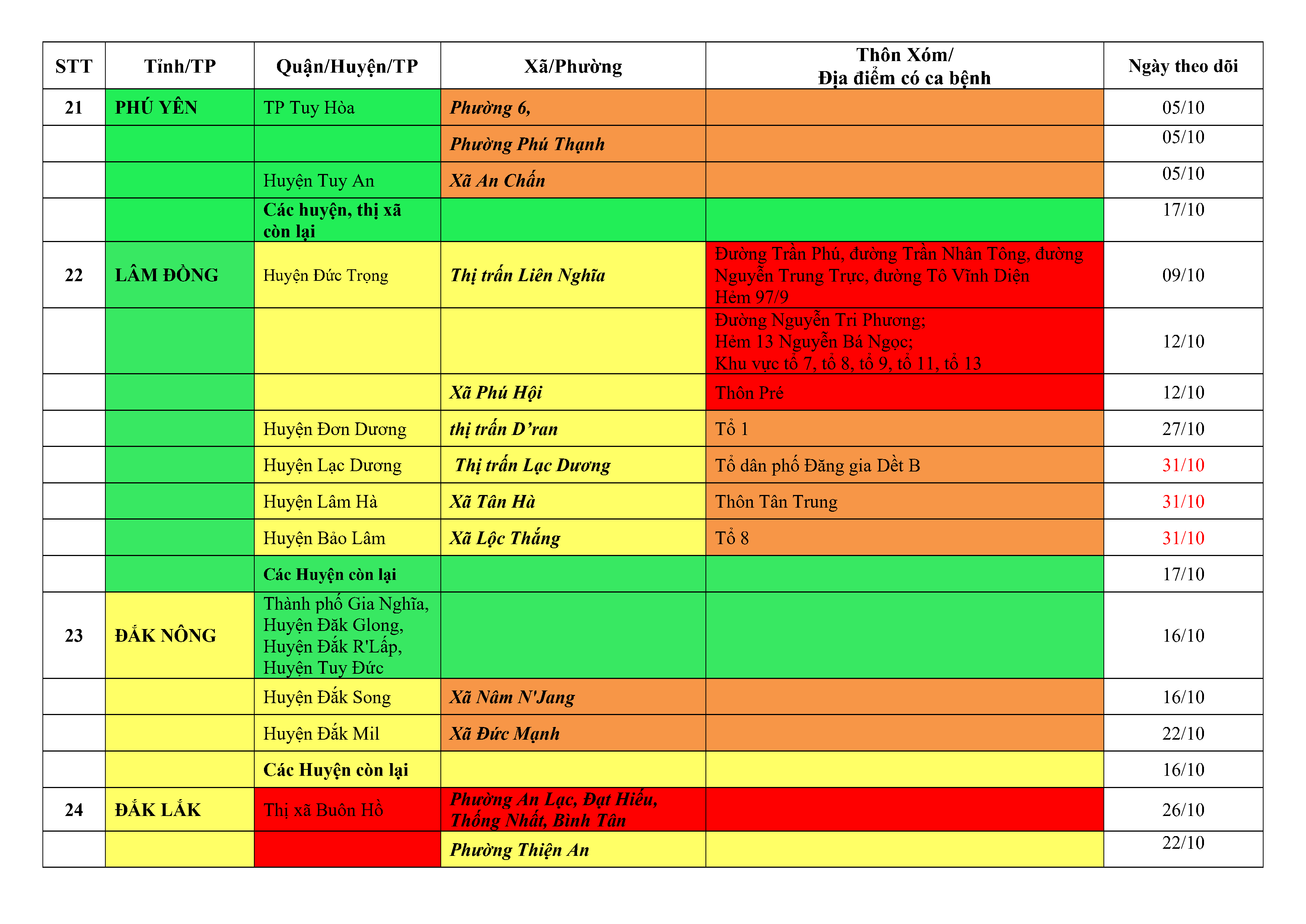 Lưu ý: Các tỉnh, thành phố không có tên trong bảng màu, đi lại bình thường, tuân thủ các biện pháp phòng chống dịch theo chỉ đạo của Bộ Y tế; khai báo y tế, thực hiện nghiêm 5K.