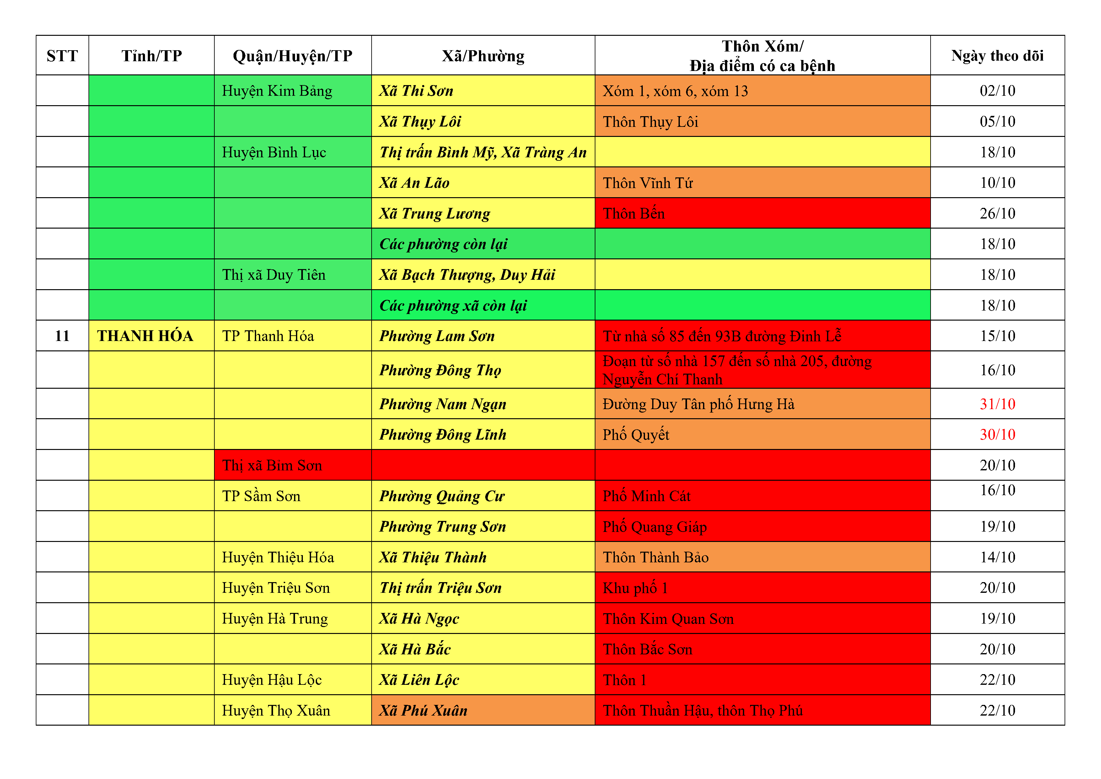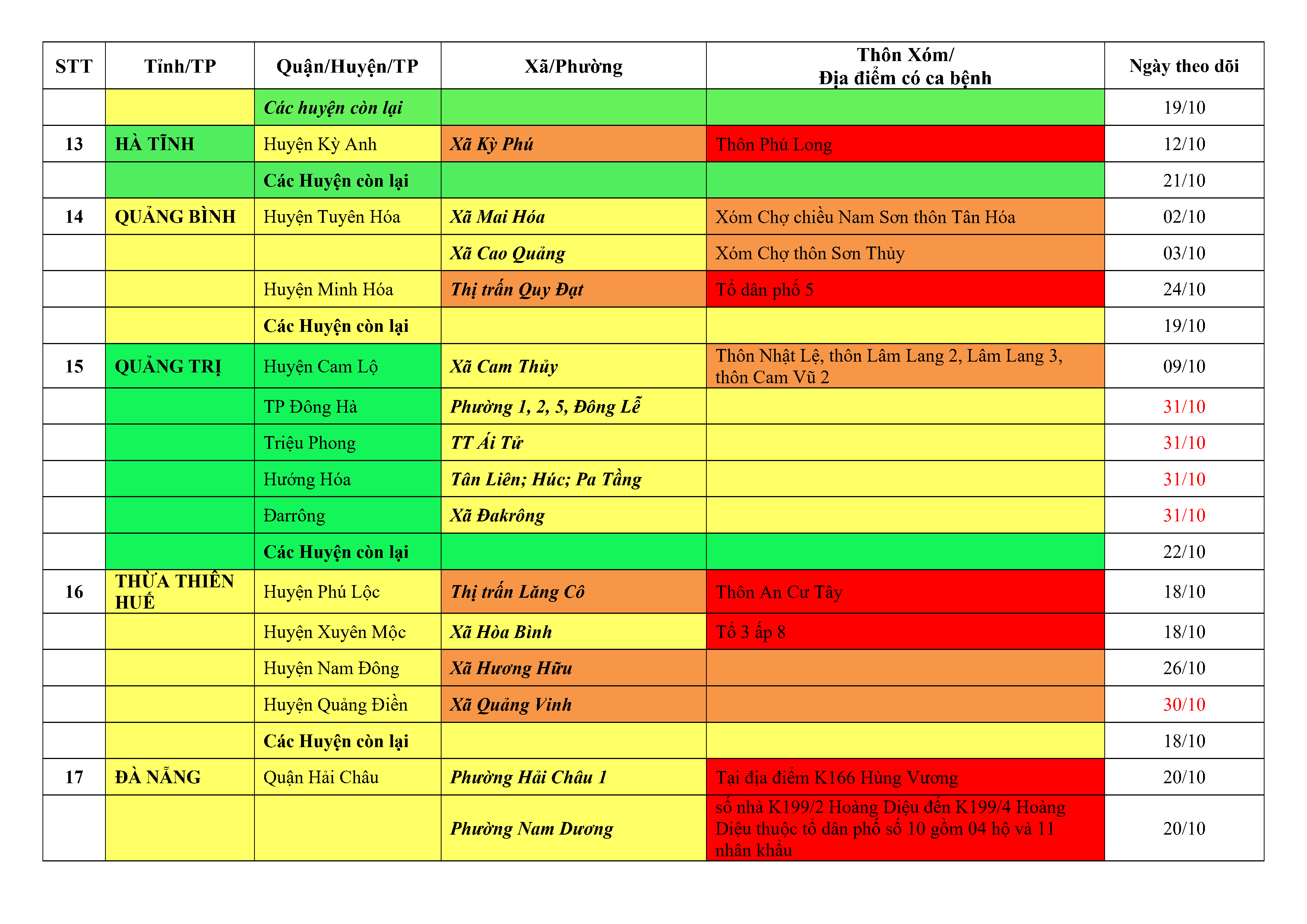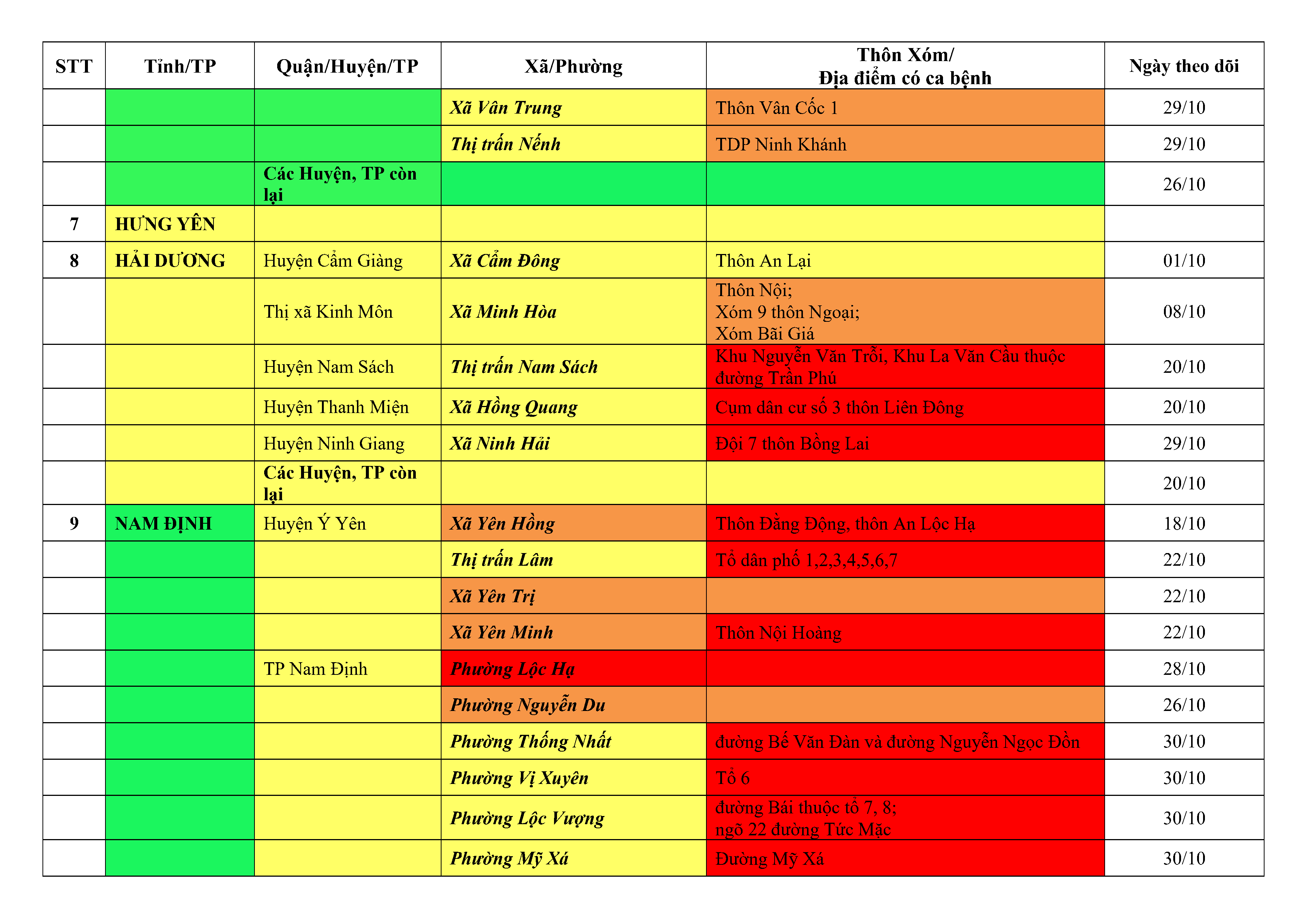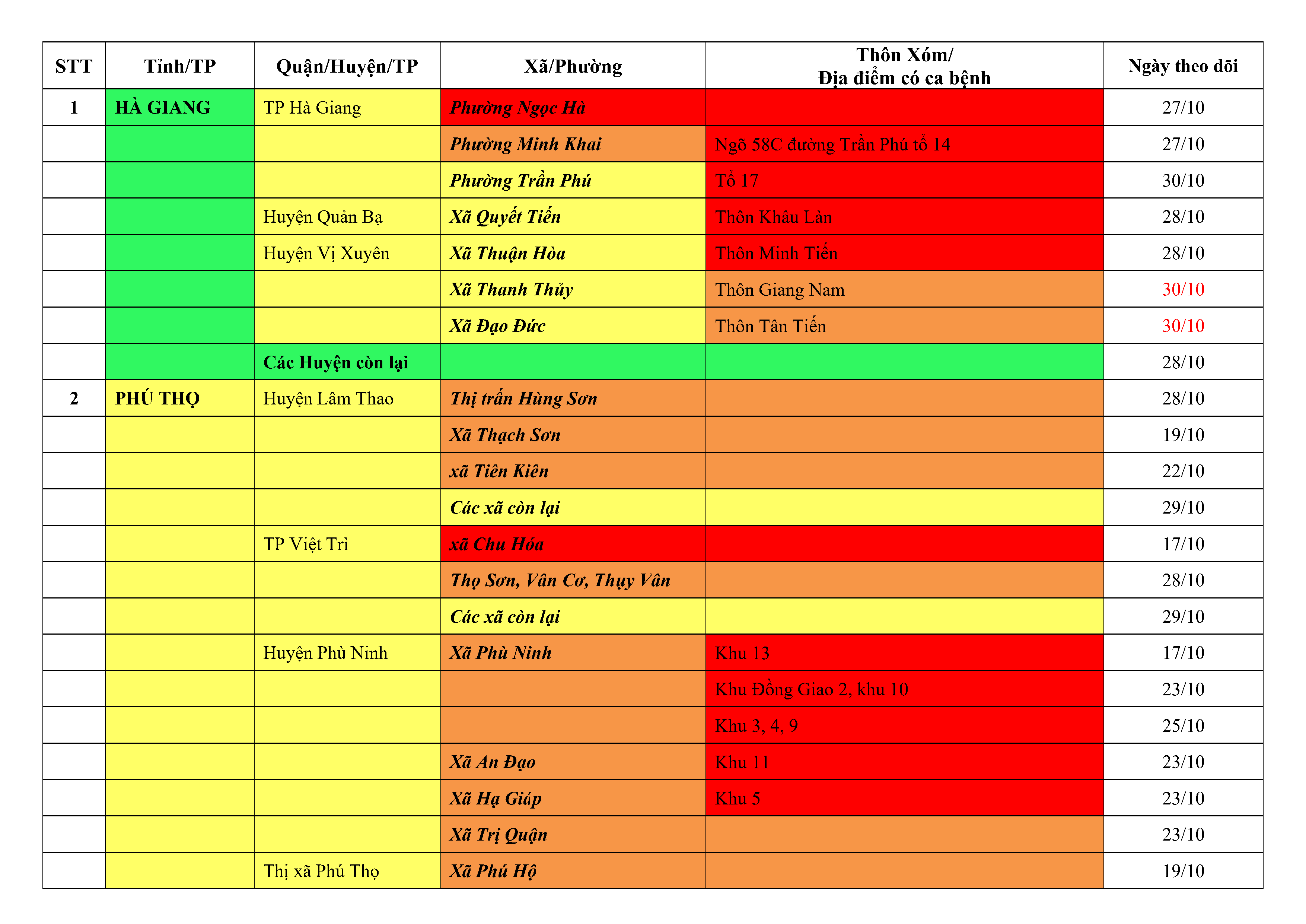 Lưu ý: Các tỉnh, thành phố không có tên trong bảng màu, đi lại bình thường, tuân thủ các biện pháp phòng chống dịch theo chỉ đạo của Bộ Y tế; khai báo y tế, thực hiện nghiêm 5K.