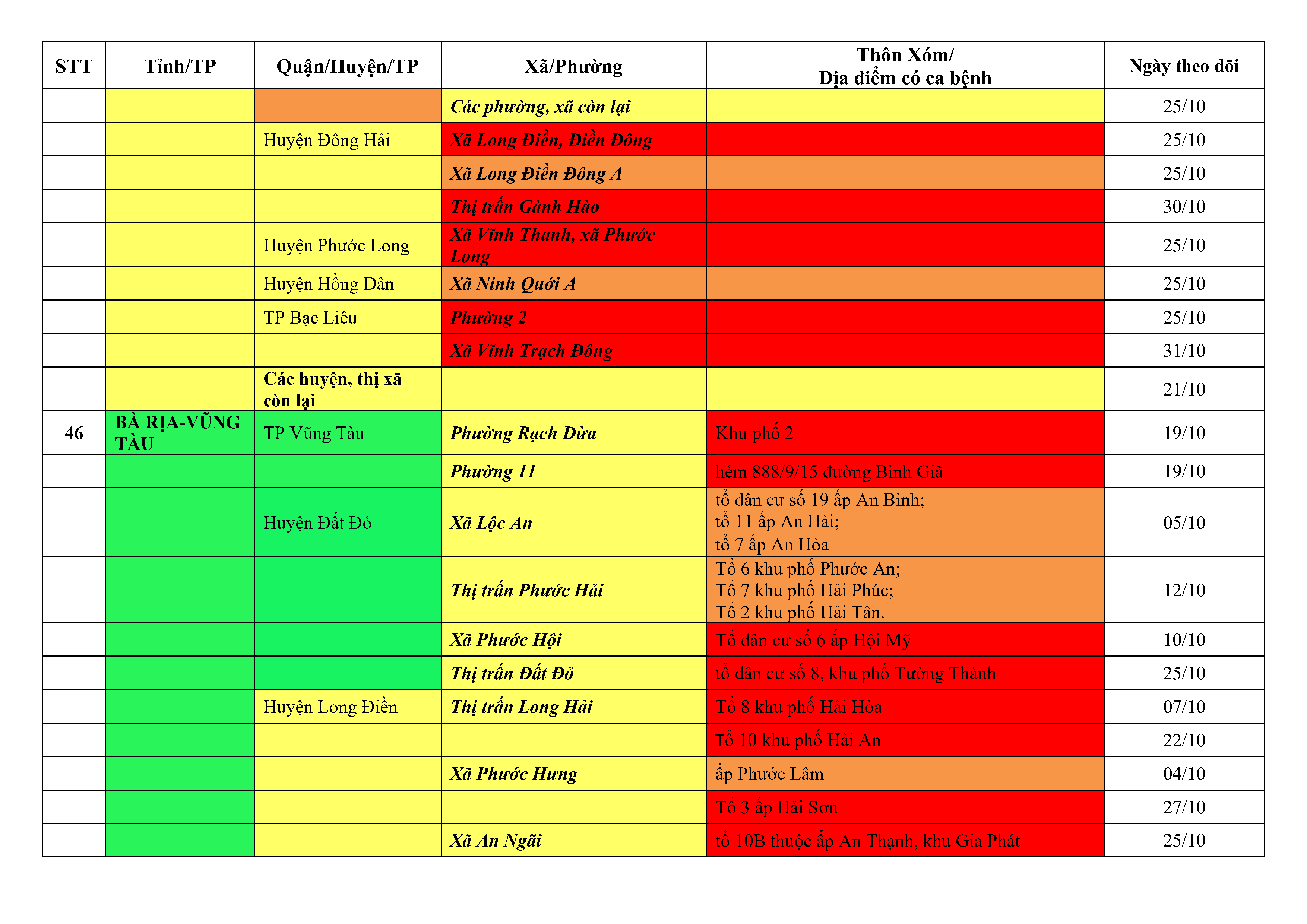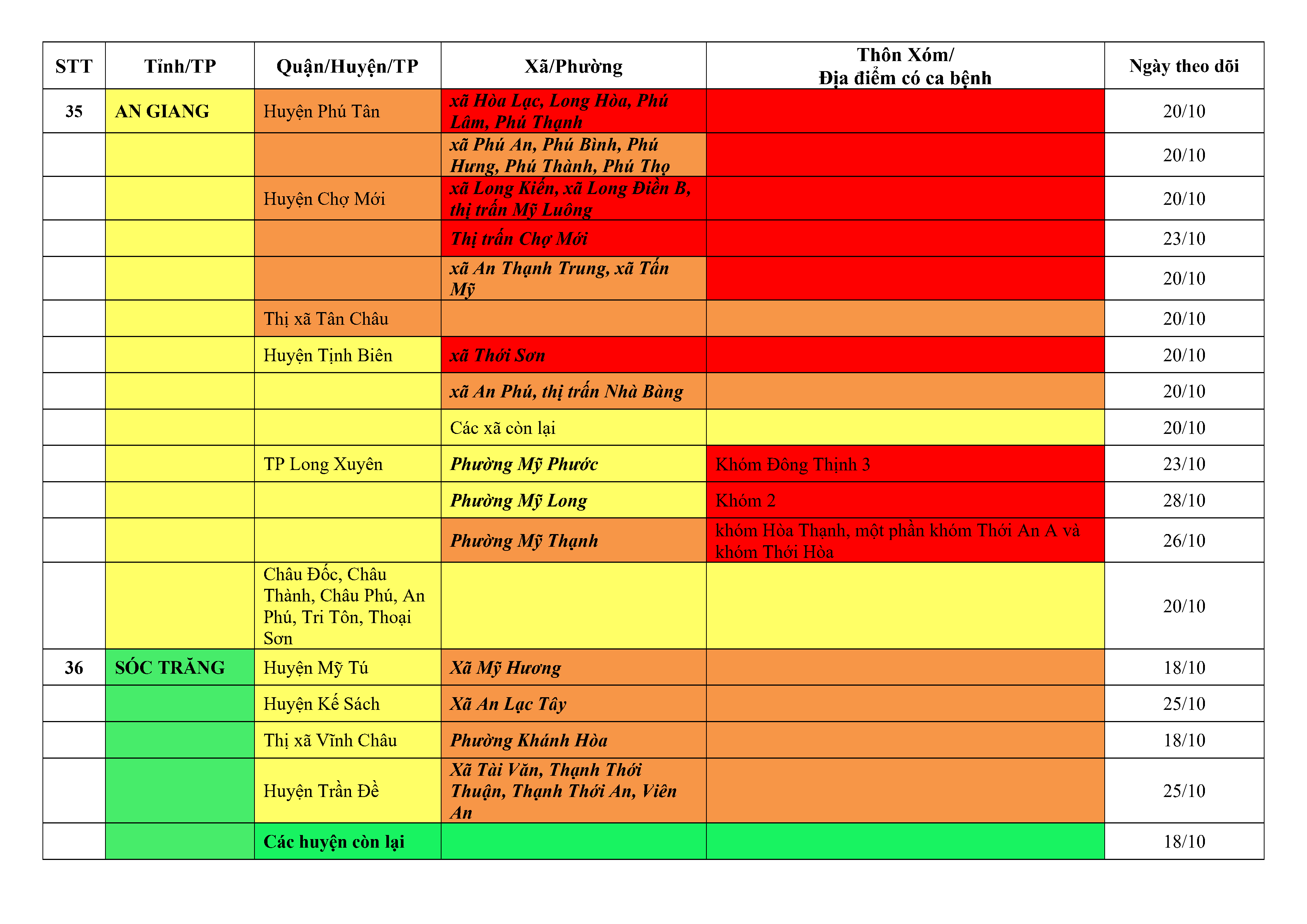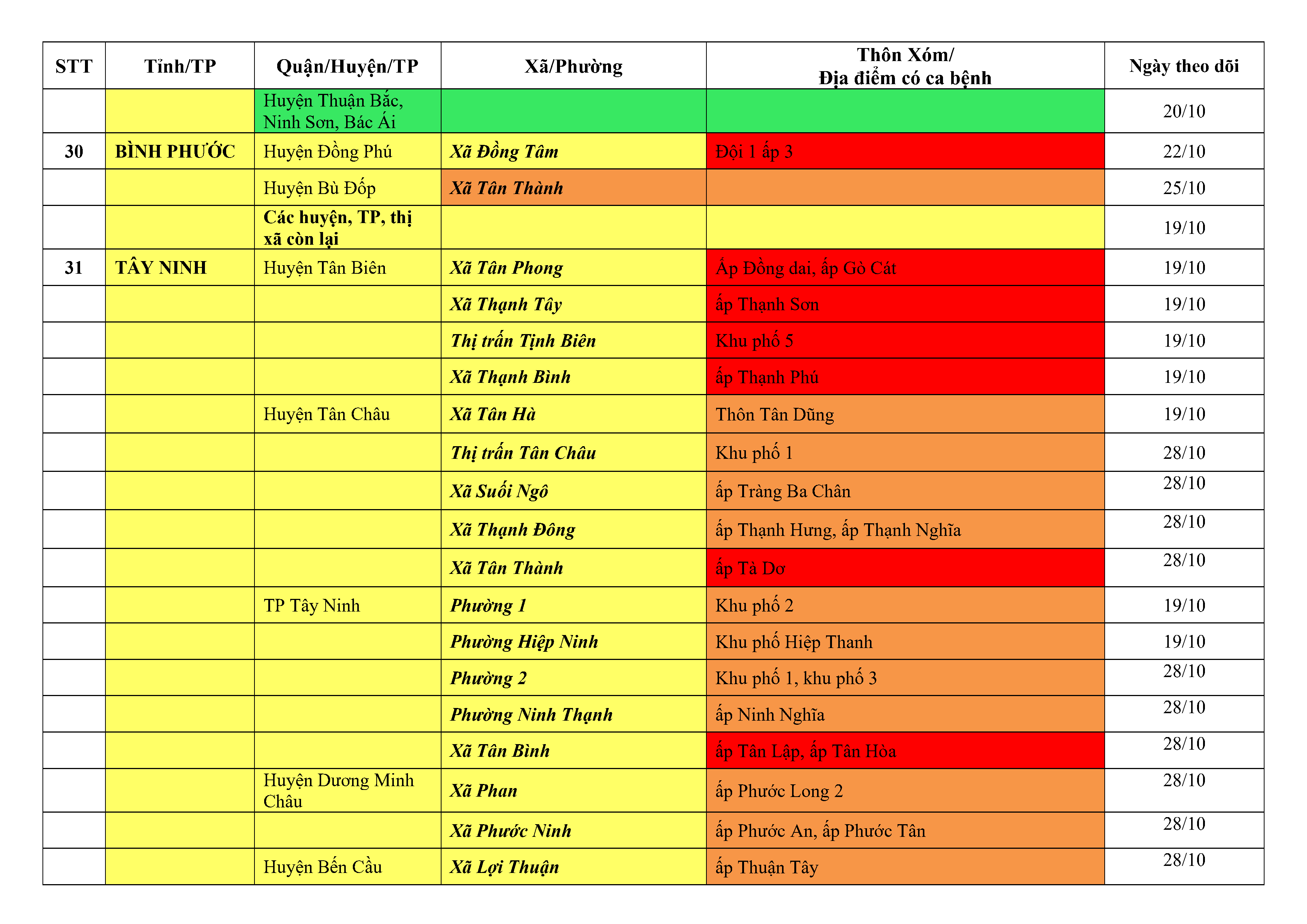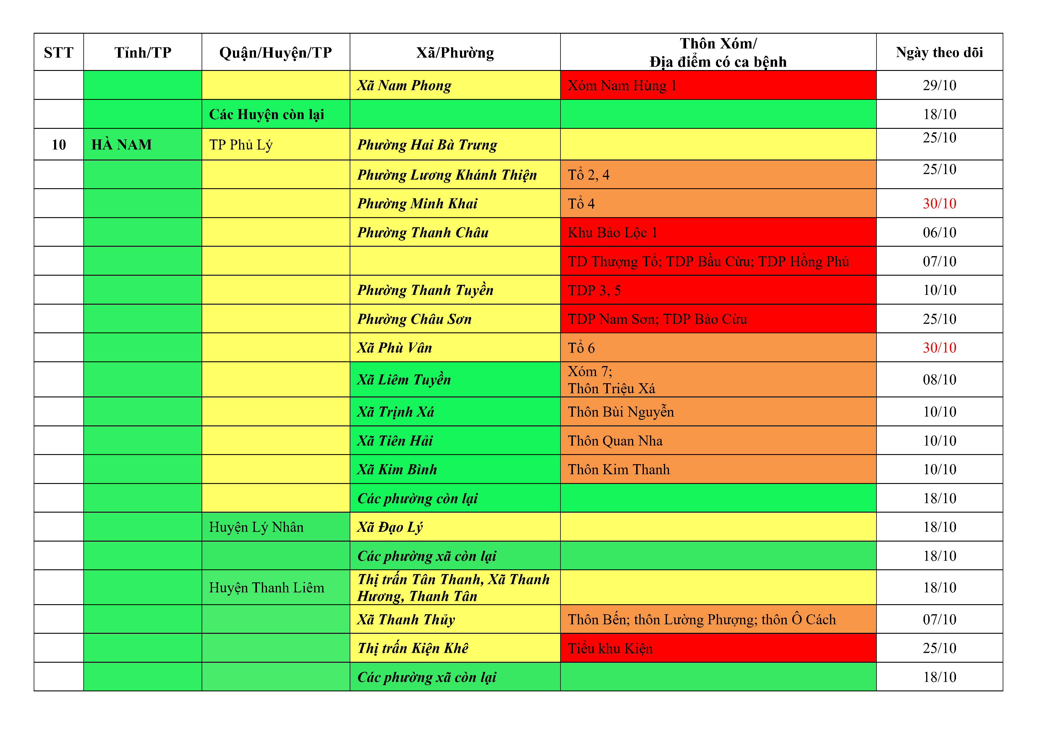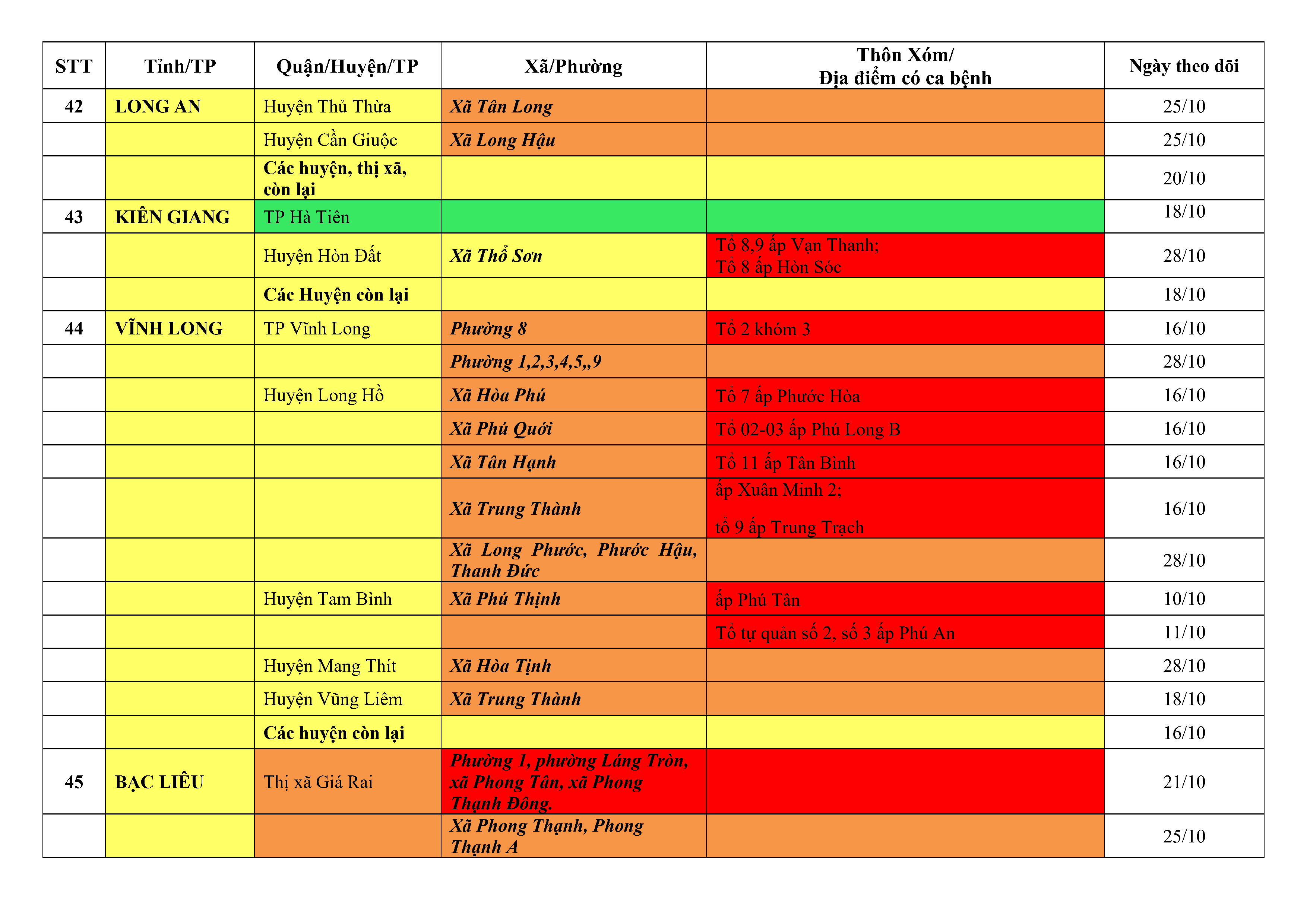 Lưu ý: Các tỉnh, thành phố không có tên trong bảng màu, đi lại bình thường, tuân thủ các biện pháp phòng chống dịch theo chỉ đạo của Bộ Y tế; khai báo y tế, thực hiện nghiêm 5K.