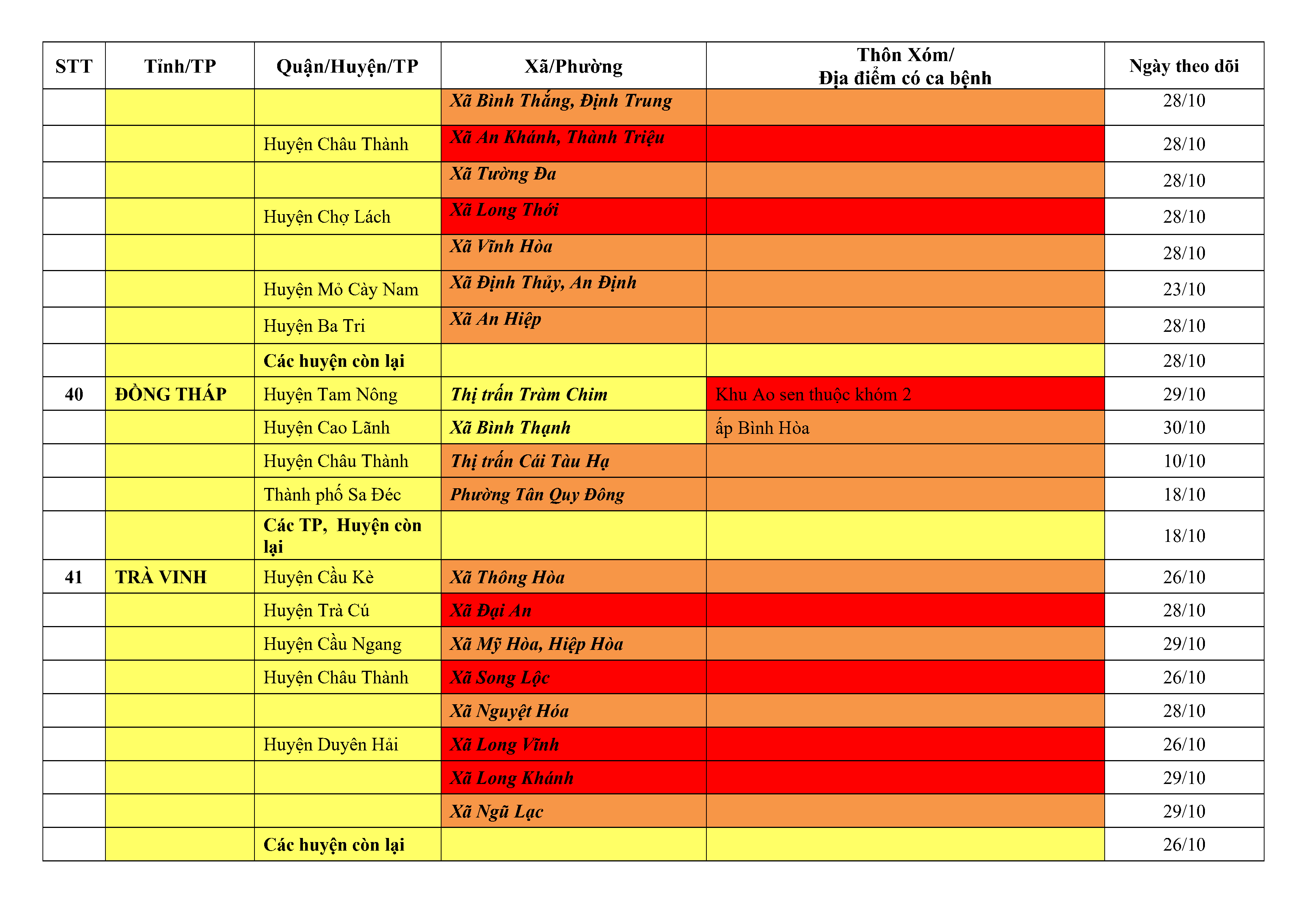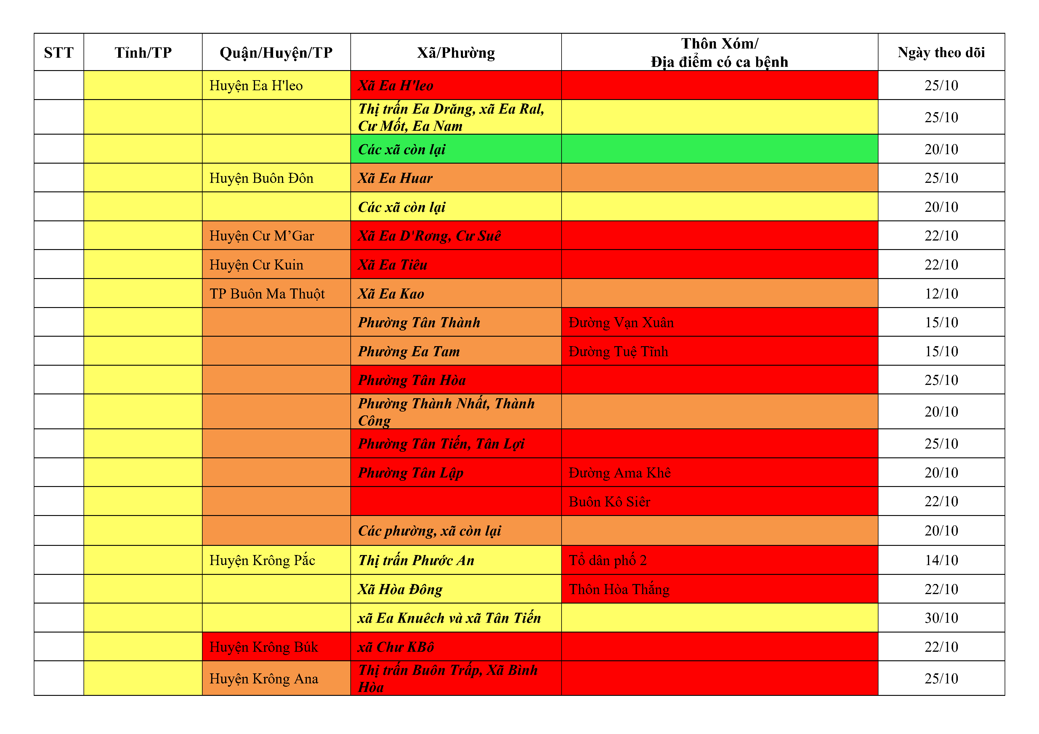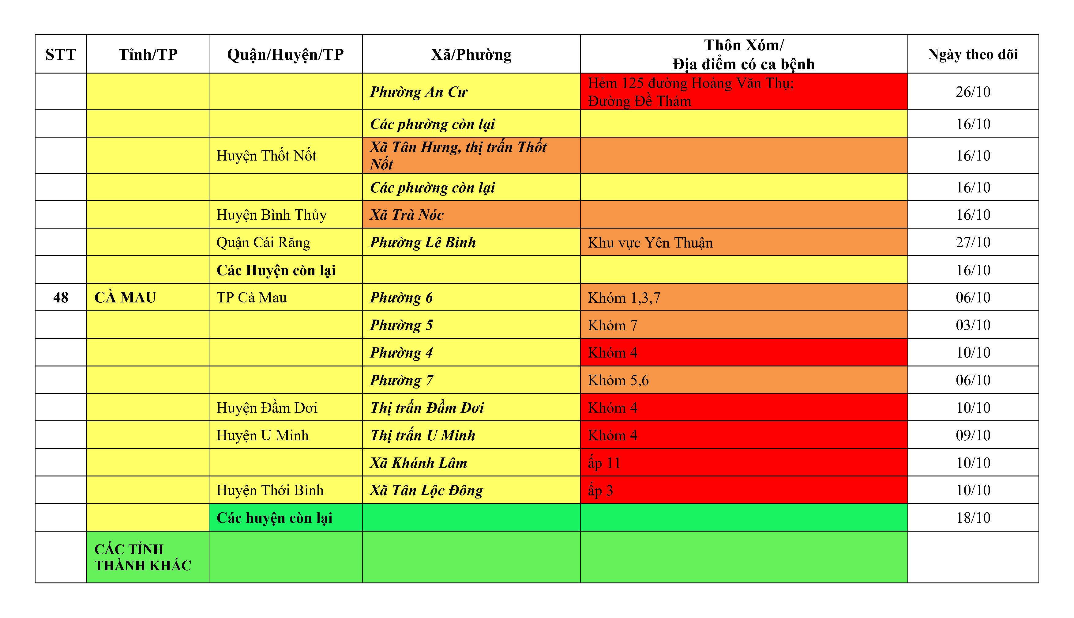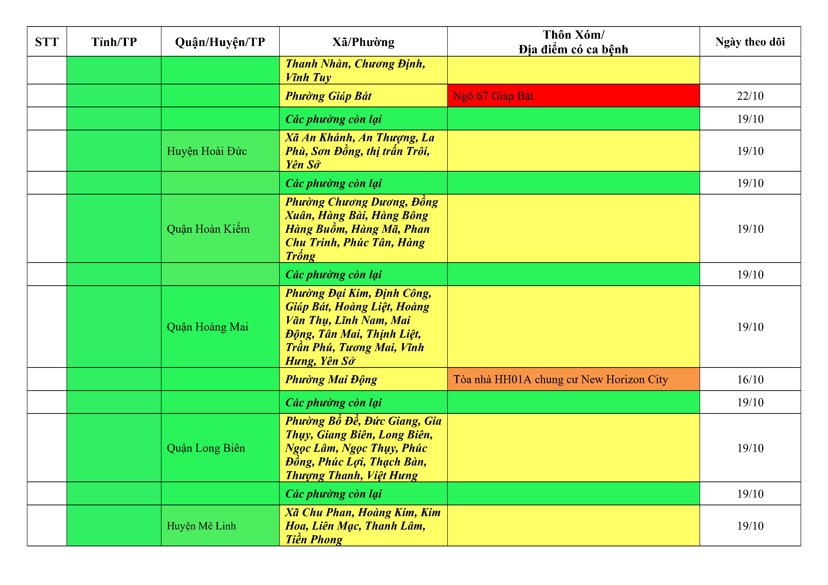 Lưu ý: Các tỉnh, thành phố không có tên trong bảng màu, đi lại bình thường, tuân thủ các biện pháp phòng chống dịch theo chỉ đạo của Bộ Y tế; khai báo y tế, thực hiện nghiêm 5K.